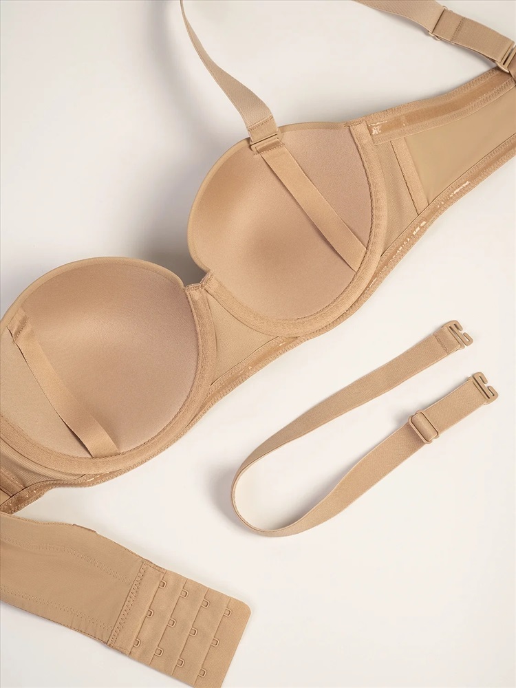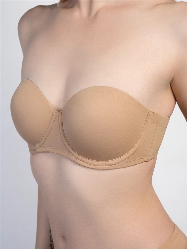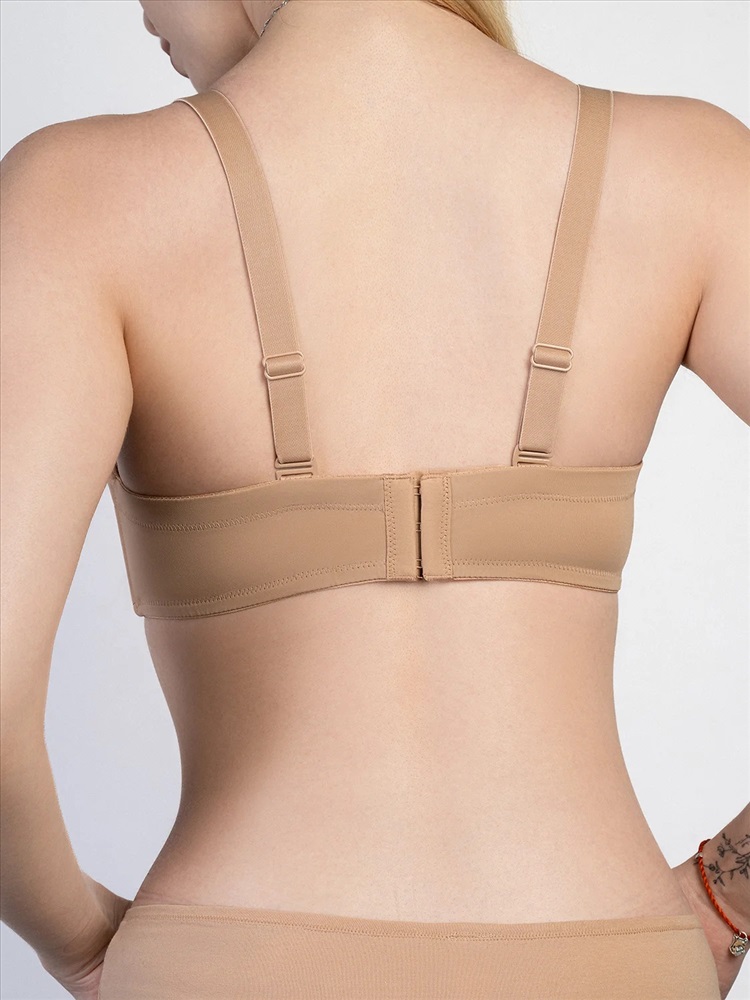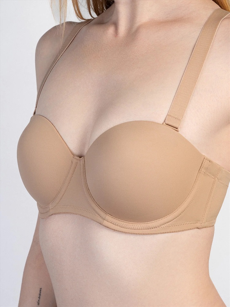 Элегантный бежевый бюстгальтер в форме бра, выполненный из высококачественного полиамида с добавлением эластана для идеальной посадки и комфорта. Модель оснащена каркасными косточками с силиконовыми вставками, которые надежно фиксируют форму, предотвращая смещение, и обеспечивают мягкую поддержку без дискомфорта.