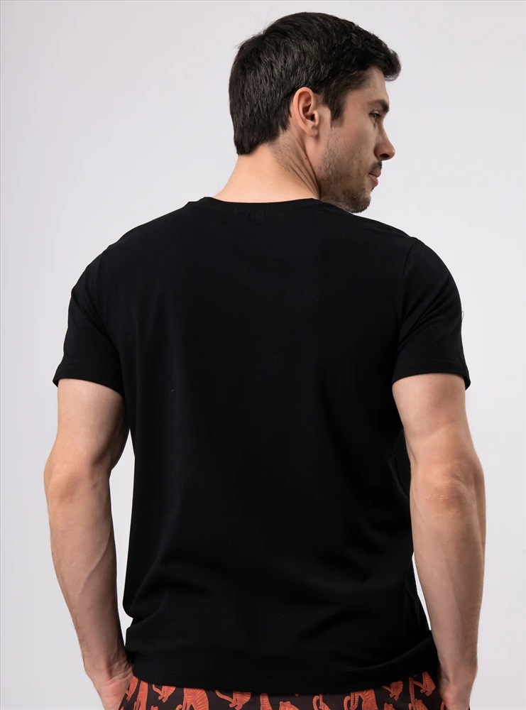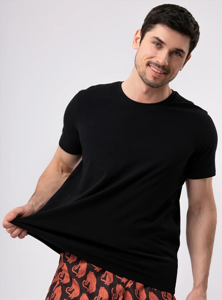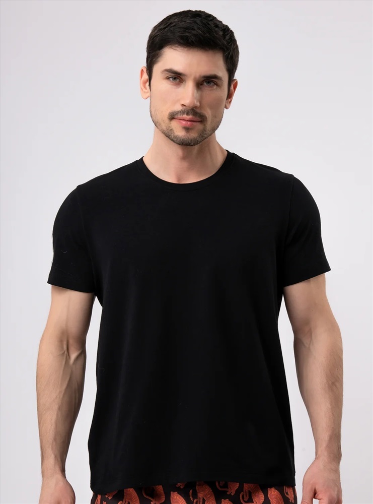 Домашняя футболка от торговой марки Индефини. Трикотажная черная футболка свободного кроя из дышащей, легкой 100% хлопковой ткани с гладкой фактурой. С классическим круглым вырезом горловины без воротника, с короткими рукавами с закрепленными отворотами, со спущенной линией плеча.
