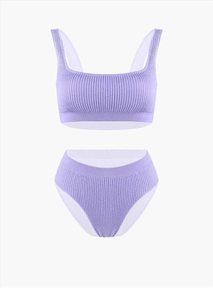 Раздельный купальник, изготовленный из полиамида, выполнен в фиолетовом цвете с фактурой ткани в рубчик. В комплекте бюстгальтер и трусы слипы. Бюстгальтер на широких бретелях без косточек имеет резинку на поясе и слитные съемные чашки без Push-Up внутри. Трусы слипы средней посадки на мягкой эластичной резинке.
