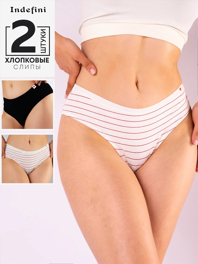 Набор трусов-танга от бренда Indefini включает две модели: одну с классическим черным дизайном, вторую — с белым фоном и красной полоской. Оба изделия выполнены из мягкого хлопка с добавлением эластана, что обеспечивает отличную посадку и комфорт в течение дня. Эластичная резинка не сдавливает и надежно фиксирует трусы на талии. Минималистичный декор в виде маленького сердечка добавляет оригинальности.