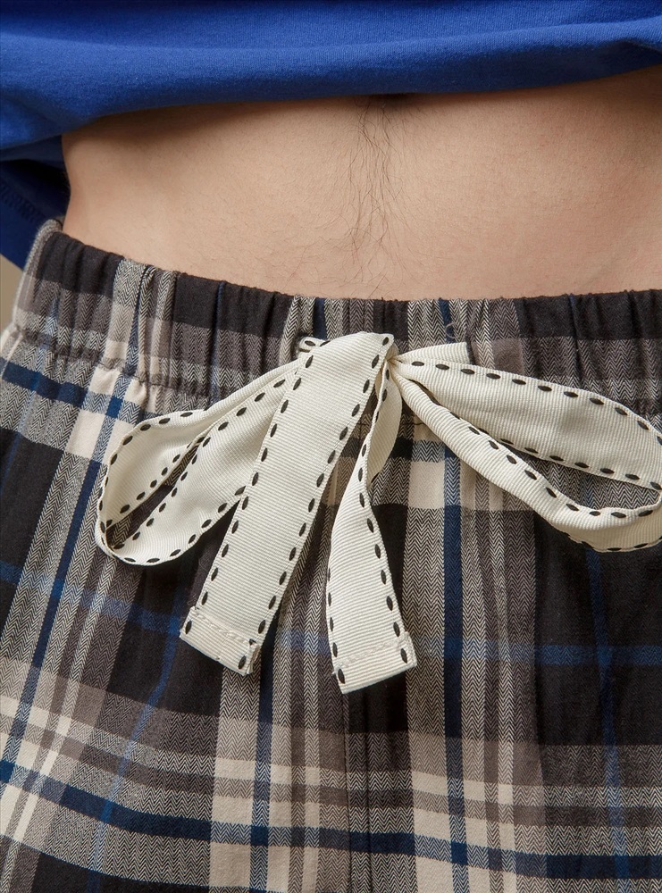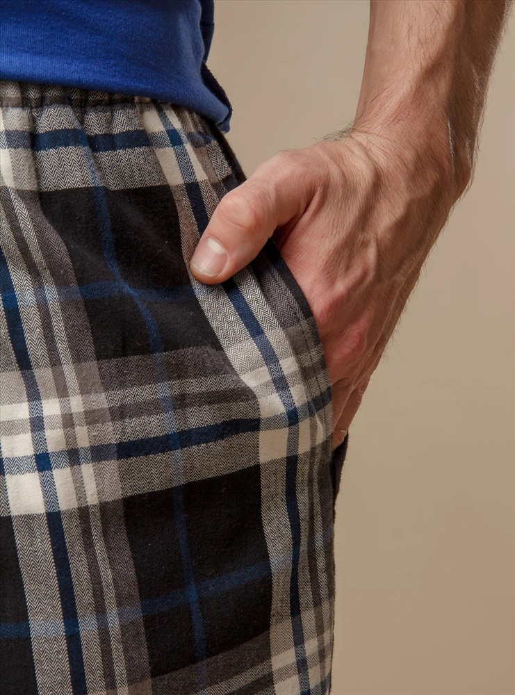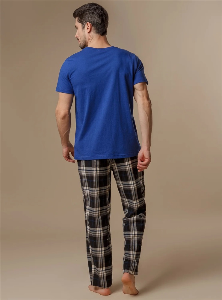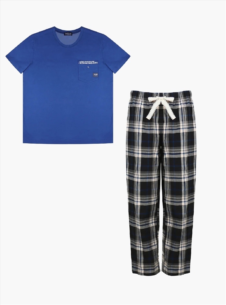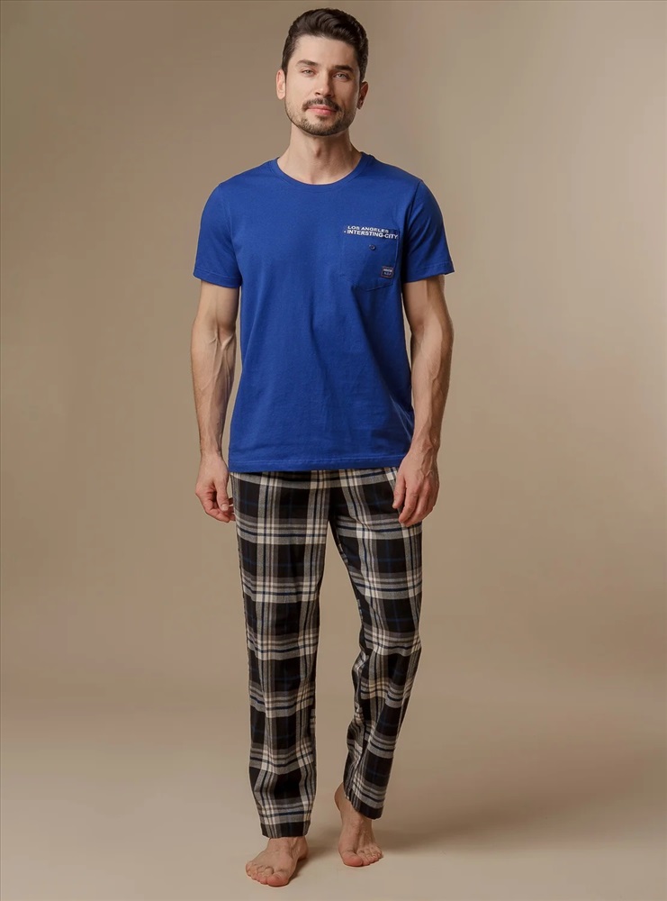 Мужская пижама выполнена из 100% хлопка, что делает ее очень мягкой и приятной на ощупь. Футболка имеет нагрудный кармашек с надписью и декоративной пуговицей. Свободный крой обеспечивает максимальный комфорт. Штаны имеют мягкую резинку для комфортной посадки, а белый регулирующий пояс украшен контрастными декоративными стежками.