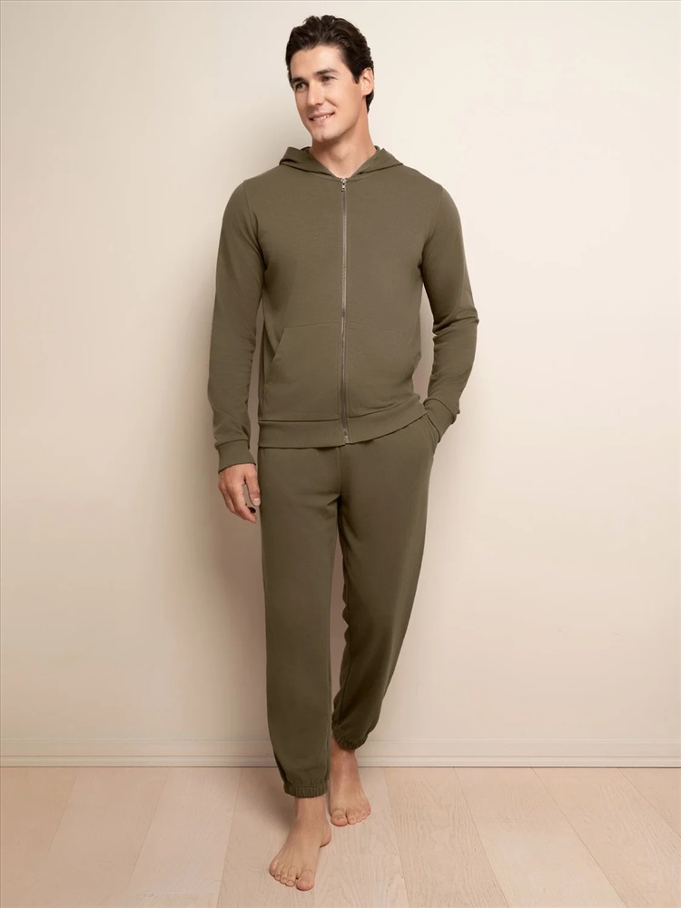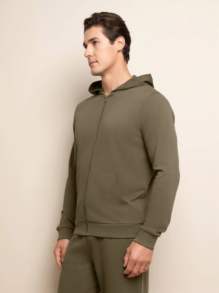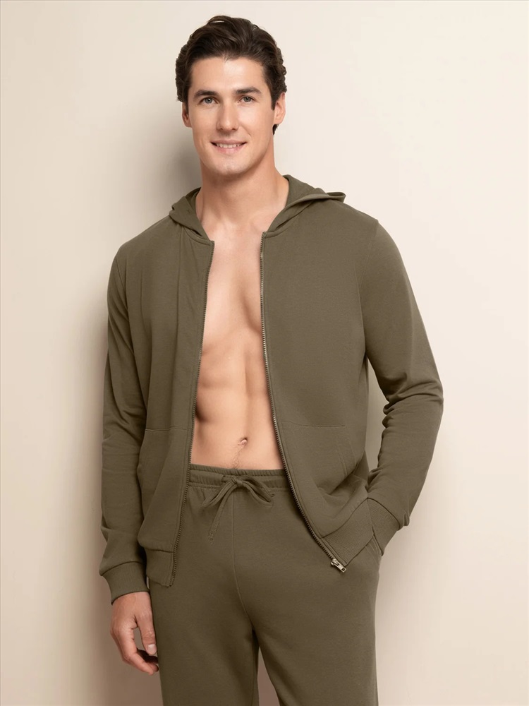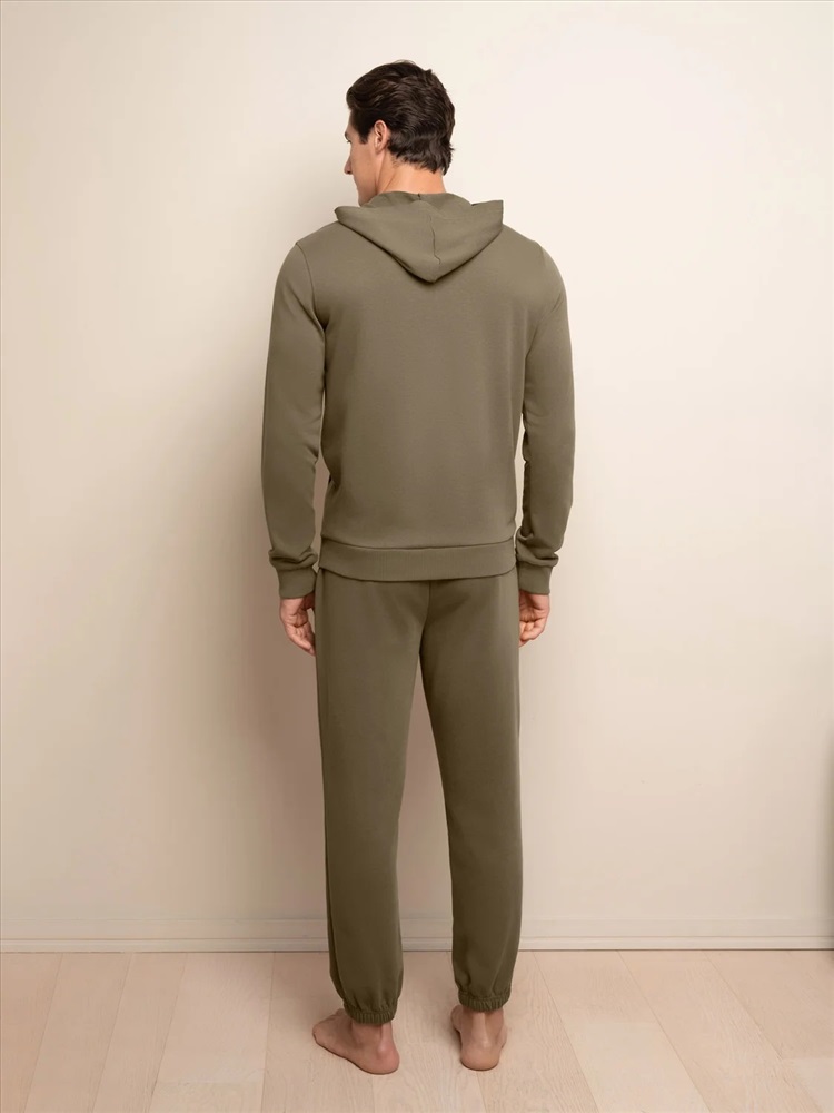 Пижама состоит из кофты и брюк. Кофта изготовлена из качественной смеси хлопка и полиэстера: хлопок обеспечивает мягкость и комфорт при носке, а полиэстер придаёт ткани прочность и устойчивость к износу, сохраняя форму даже после многочисленных стирок. Кофта на молнии позволяет легко надевать и снимать её, а боковые карманы подходят для хранения мелочей. Длинные рукава с манжетами обеспечивают удобную посадку, а капюшон со шнурком добавляет спортивный стиль и защиту в прохладную погоду. Эластичная резинка внизу фиксирует кофту на талии, обеспечивая оптимальную посадку и дополнительную защиту от ветра. Брюки из смеси хлопка и полиэстера прямого кроя обеспечивают комфорт и практичность. Широкая эластичная резинка на талии и регулирующий шнурок позволяют оптимально адаптировать посадку по фигуре, обеспечивая удобство в повседневной носке. Манжеты на штанинах добавляют стильный акцент и помогают брюкам удобно фиксироваться, не создавая неудобств при движении.