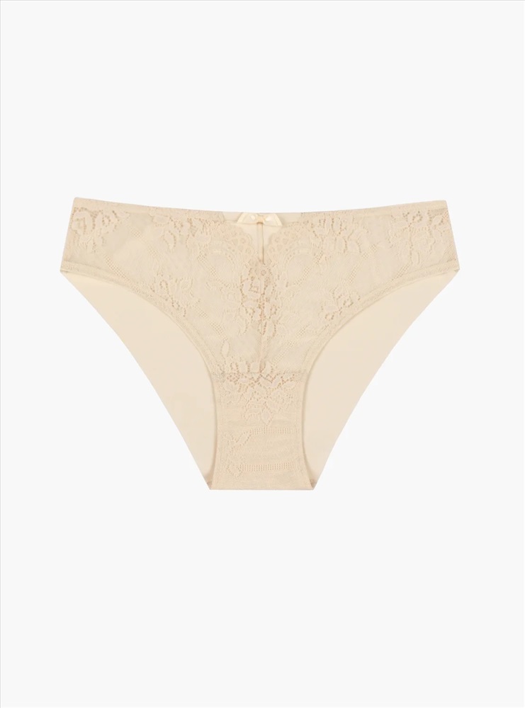 Трусы-слипы нежного бежевого оттенка, выполненные из мягкой эластичной ткани. Модель украшена изящной кружевной вставкой с миниатюрным бантиком в передней части.