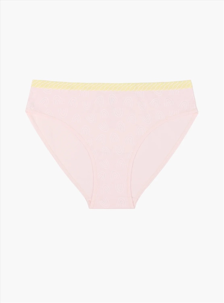 Трусы слипы женские изготовлены из хлопка и выполнены в розовом цвете с абстрактным принтом. Трусы с мягкой эластичной жёлтой резинкой на талии имеют среднюю посадку. На внутренней стороне трусов расположена хлопковая ластовица.