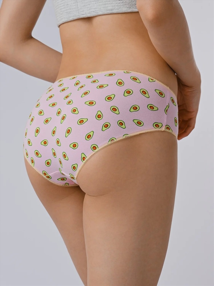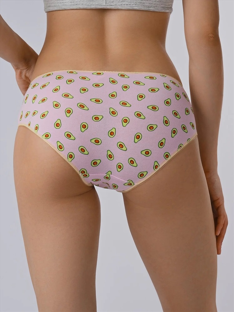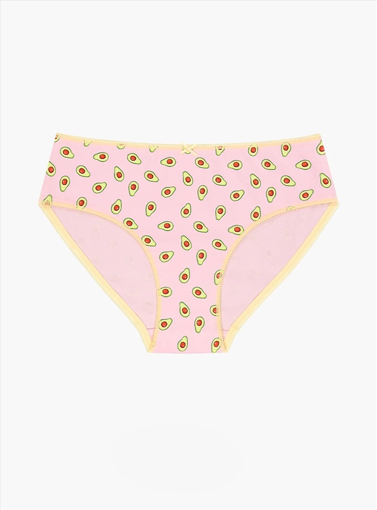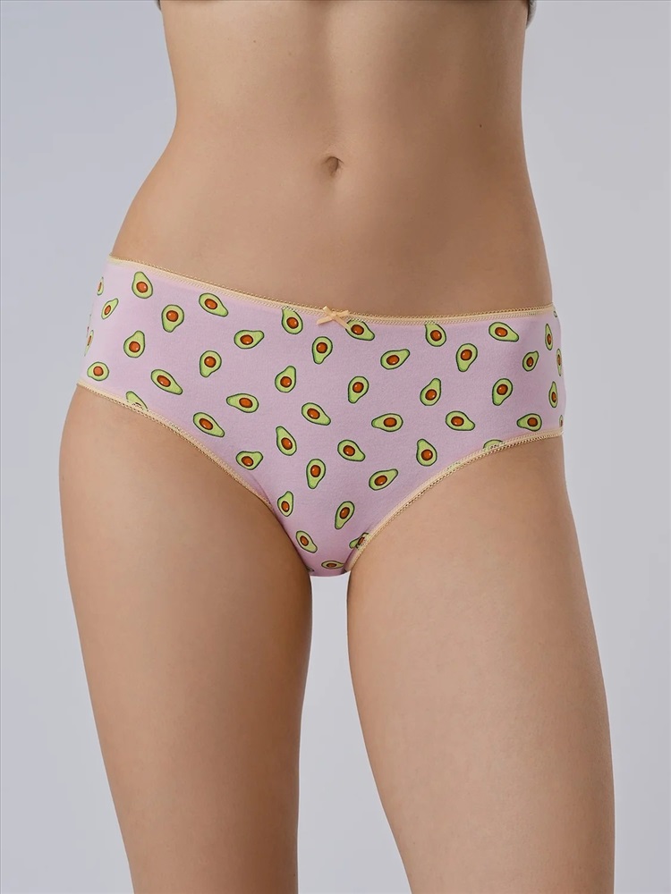 Трусы слипы женские изготовлены из хлопка. Они выполнены в розовом цвете с нанесенным фруктовым принтом с изображением авокадо. Трусы имеют среднюю посадку и мягкую тонкую желтую резинку на талии. На передней части имеется желтый декоративный бантик. На внутренней стороне трусов расположена хлопковая ластовица.