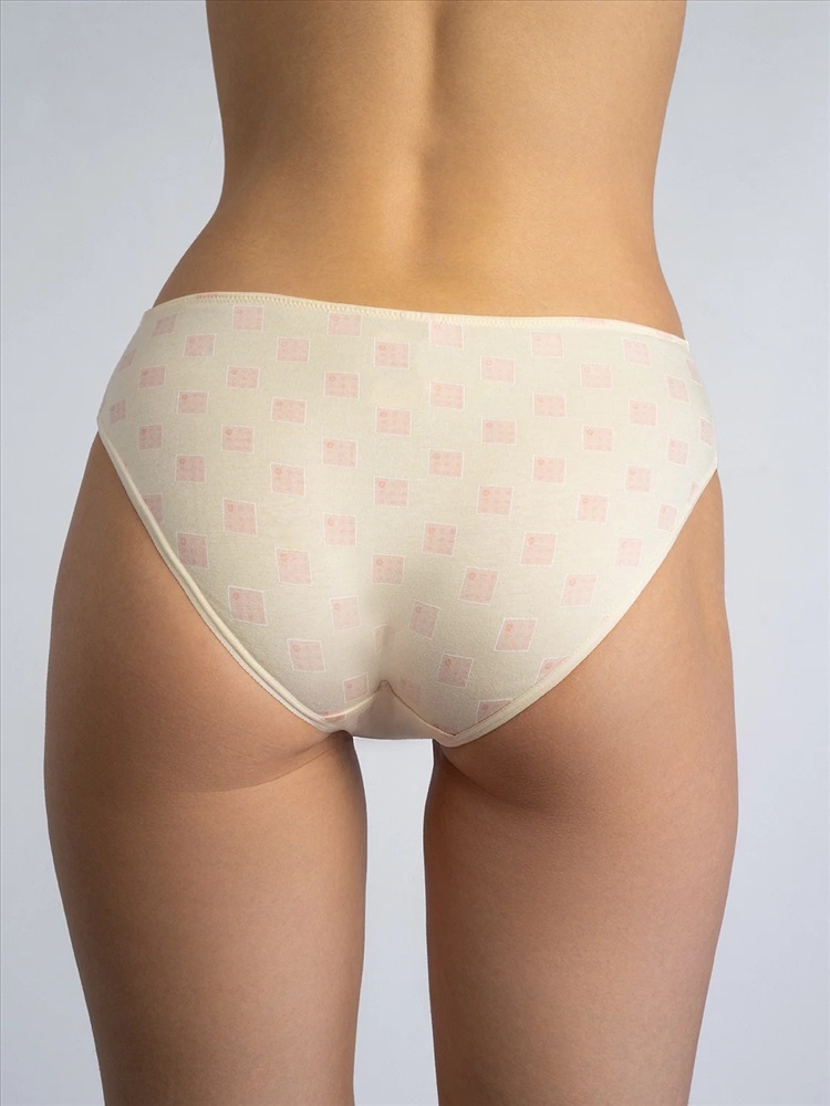 Благодаря светло-кремовому фону и мелкому розовому принту в виде квадратиков с цветочками, эти трусы создают ощущение легкости, уюта и нежности — как будто вы надели маленькое летнее настроение.
