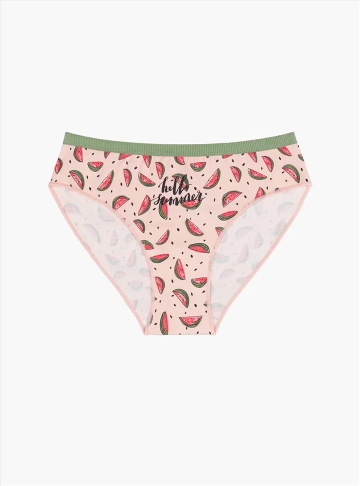 - Дизайн: Принт с арбузами и зелёная резинка на поясе.