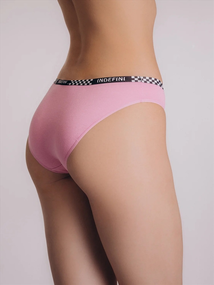 Розовые трусы-слипы от бренда Indefini с ярким принтом и надписью "GOOD LUCK" на передней части. Модель выполнена из мягкого хлопка с добавлением эластана, что обеспечивает отличную посадку и комфорт в течение дня. Эластичная резинка с фирменным логотипом и контрастным узором надежно фиксирует изделие на талии, не сдавливая кожу.