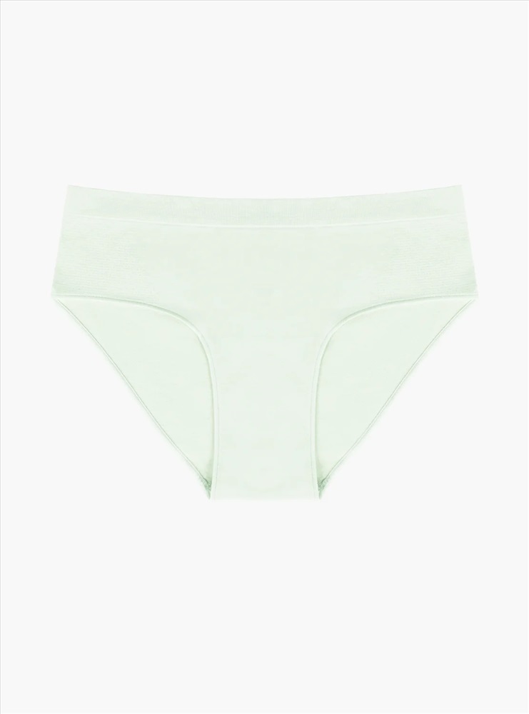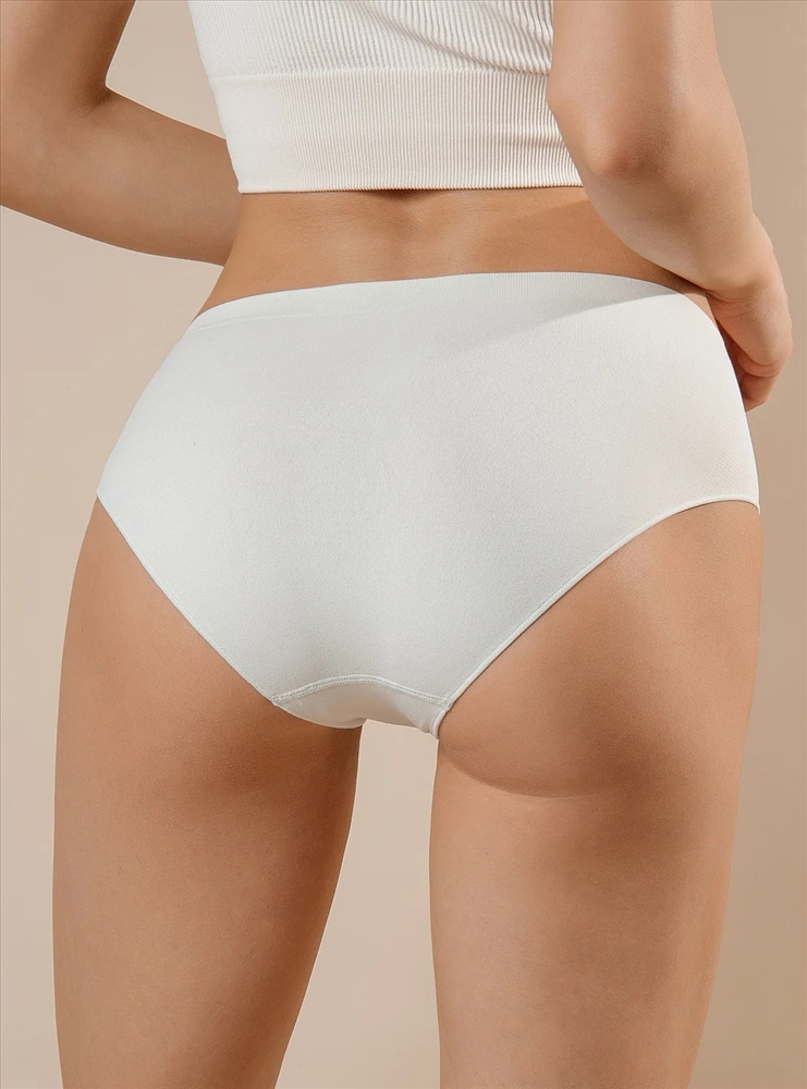 Женские трусы от торговой марки Индефини. Трусы-слипы светлого цвета с высокой посадкой, изготовлены из мягкой микрофибры в тонкий рубчик без боковых швов, дополнены гигиенической хлопковой ластовицей, вырезы для ног обработаны плоским швом вподгибку с резинкой, широкий пояс на резинке плотно фиксирует на теле.
