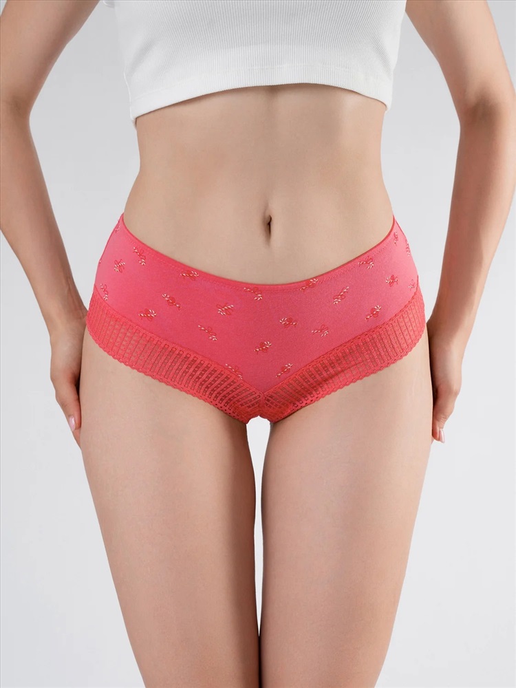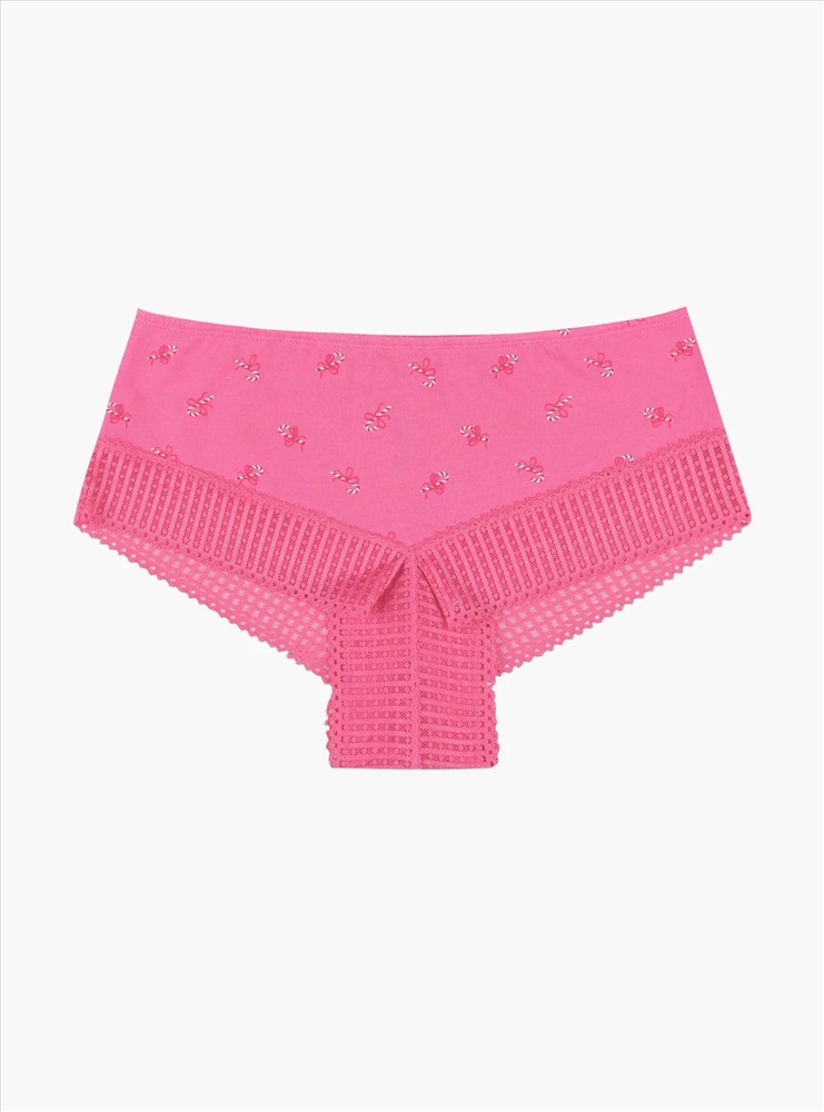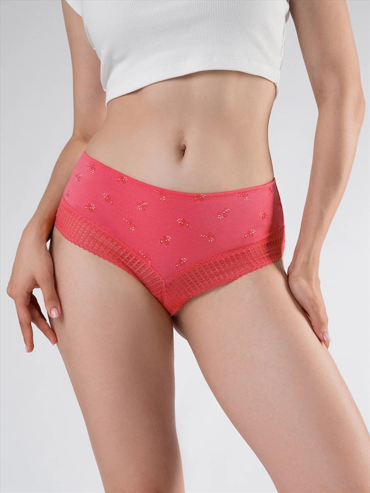 Женские трусы-шорты розовые высокой посадки плотно прилегают к телу, не сползая при носке за счет резинки на талии. Украшением трусов является принт с изображением новогодних леденцов с розовым кружевным обрамлением.