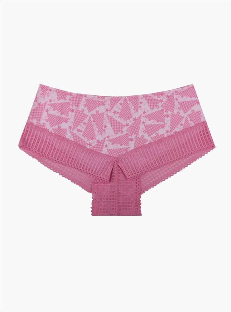 Женские трусы-шорты розовые высокой посадки плотно прилегают к телу, не сползая при носке за счет резинки на талии. Украшением трусов является розовое кружевное обрамление и геометрический принт с изображением контуров ёлочек и звёздочек.