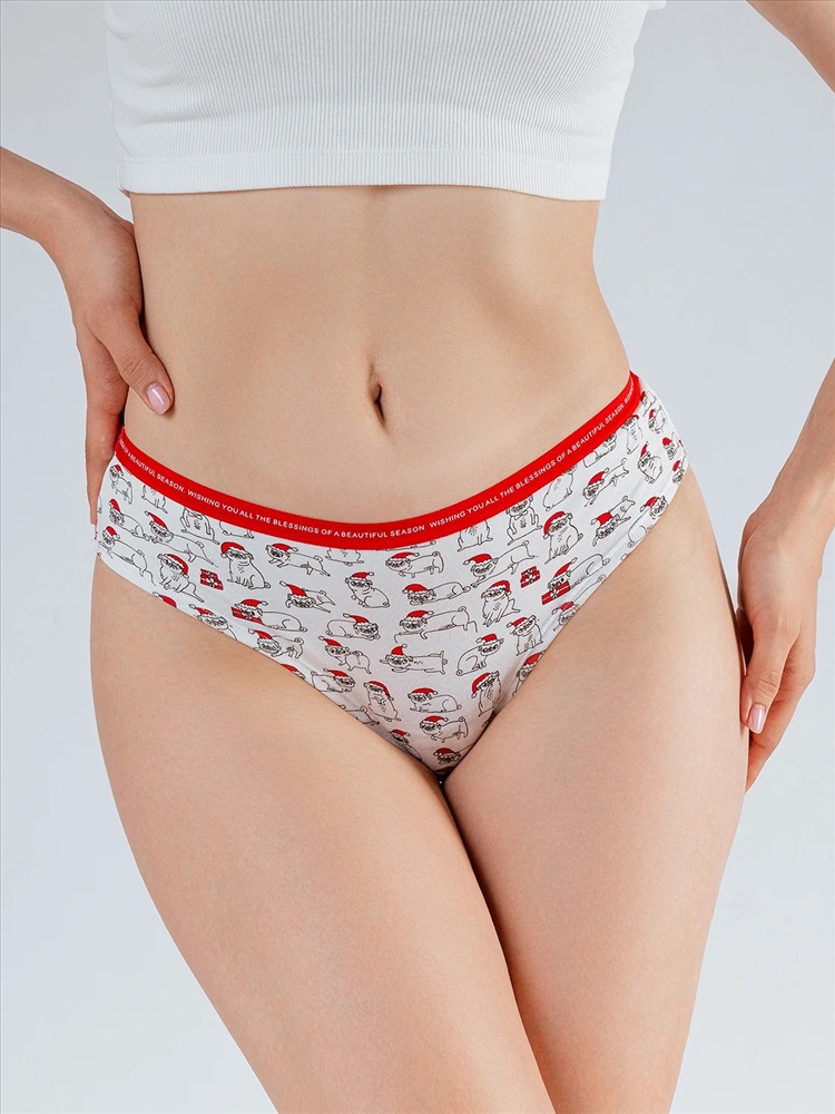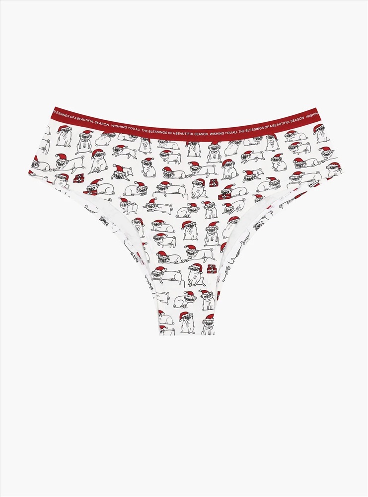 Трусы танга женские, изготовленные из хлопка, обеспечивают оптимальную посадку и свободу движений. Эластичная резинка на талии надежно удерживает трусы на теле во время носки. Украшением женских трусов танга является принт с изображением новогодних мопсов.