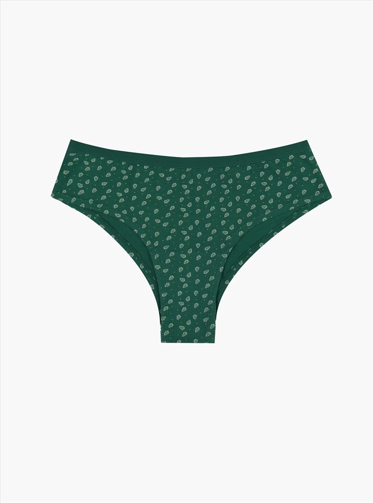 Трусы танга женские зеленые, изготовленные из хлопка, надежно прилегают к телу благодаря мягкой эластичной резинке на талии. Хлопковый материал является дышащим и пропускающим воздух, обеспечивая приятные ощущения при носке. Трусы украшены принтом с изображениями ёлочек. Женские трусы помогут создать новогоднее настроение и придать радости в повседневность.