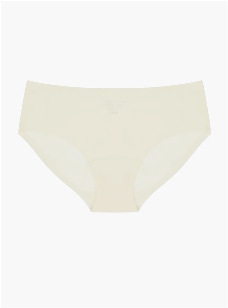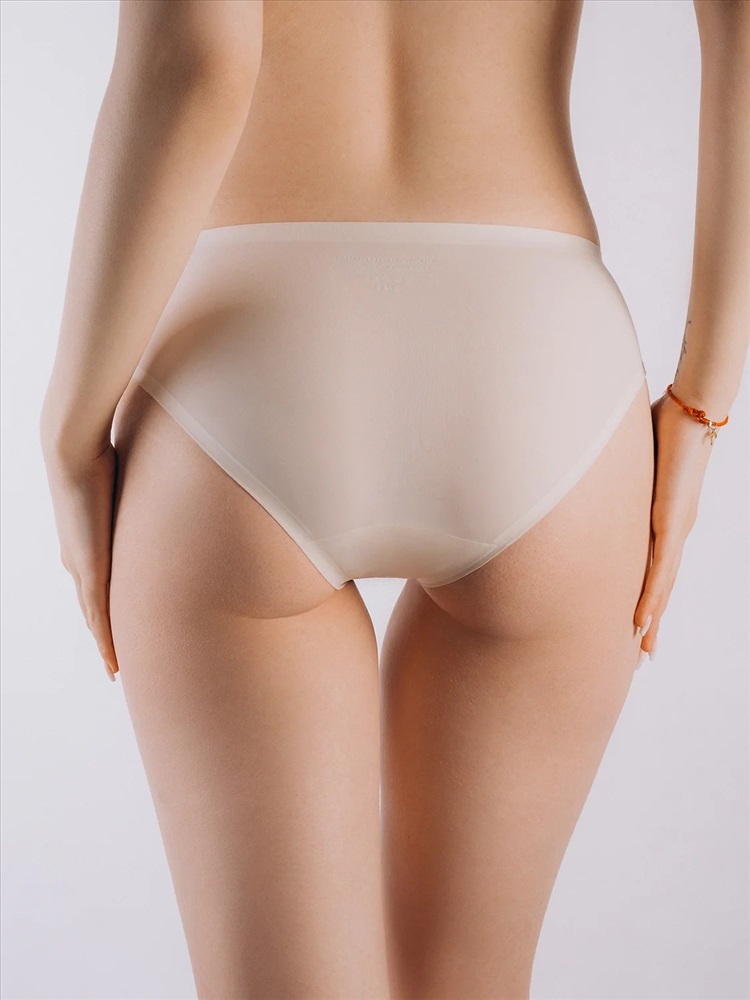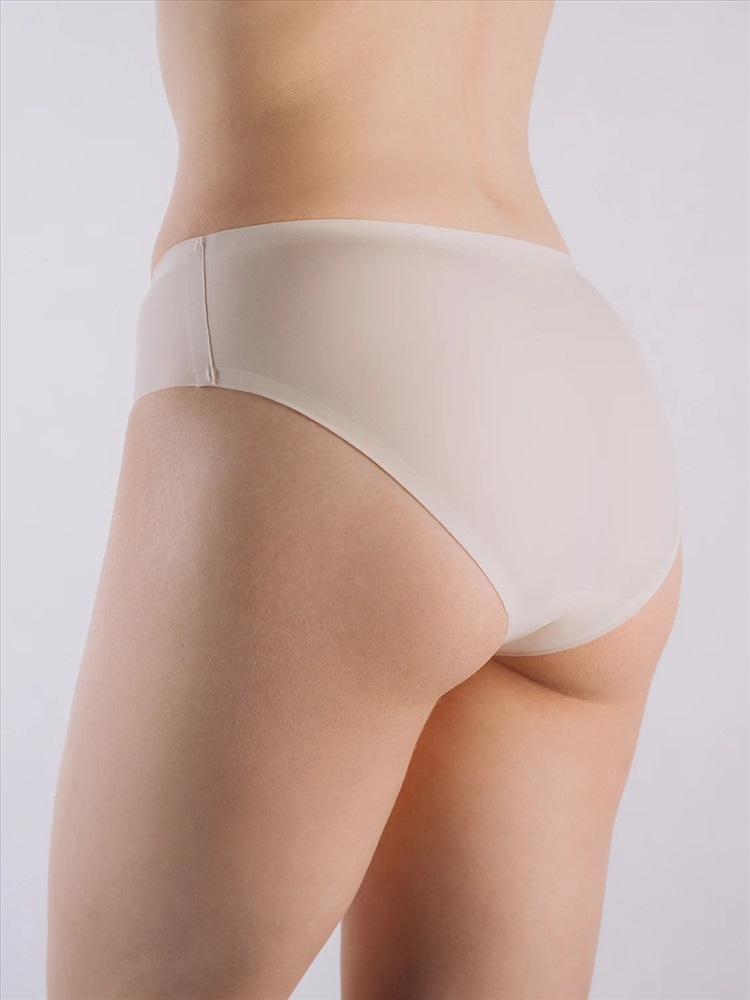Трусы слипы женские изготовлены из тянущегося полиамидного материала, выполнены в молочном цвете. Трусы средней посадки держатся на талии мягкой эластичной резинкой. На внутренней стороне трусов расположена хлопковая ластовица.
