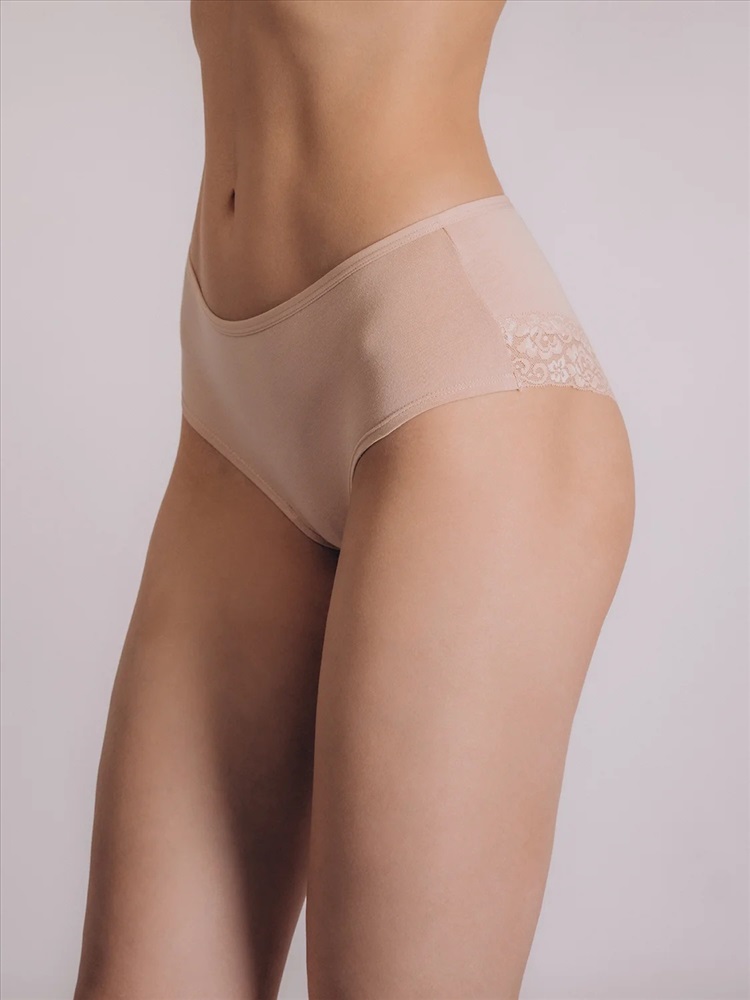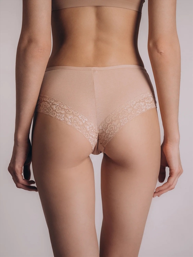 Бежевые трусы-слипы из натуральных материалов. Модель выполнена из мягкого хлопка с добавлением эластана, что обеспечивает отличную посадку и комфорт на каждый день. Задняя часть украшена изящным кружевом, которое плавно переходит на переднюю часть, создавая эффект рюшек и добавляя образу женственности и утончённости.
