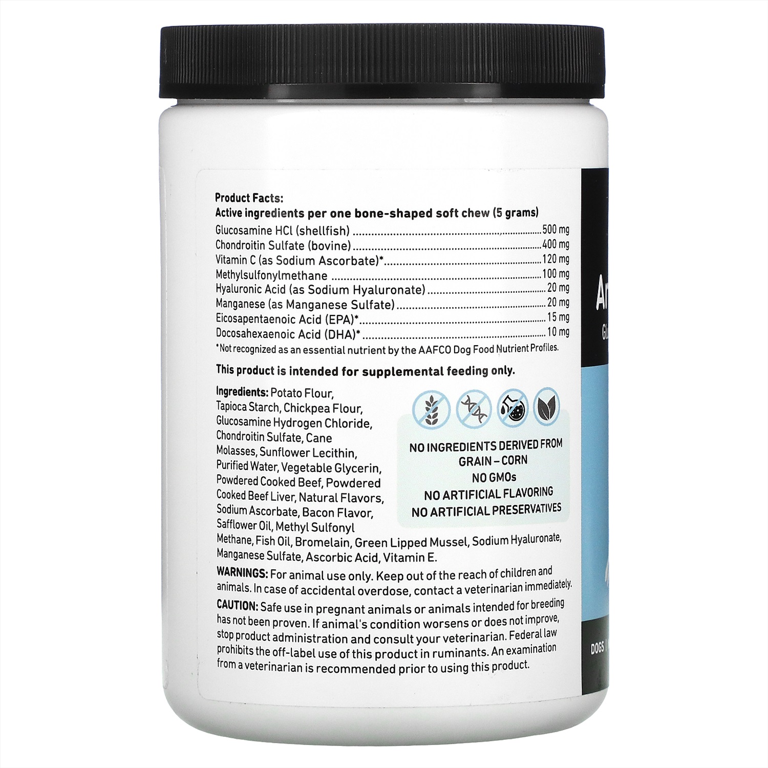 ИнгредиентыPotato flour, tapioca starch, chickpea flour, glucosamine hydrogen chloride, chondroitin sulfate, cane molasses, sunflower lecithin, purified water, vegetable glycerin, powdered cooked beef, powdered cooked beef liver, natural flavors, sodium ascorbate, bacon flavor, safflower oil, methyl sulfonyl methane, fish oil, bromelain, green lipped mussel, sodium hyaluronate, manganese sulfate, ascorbic acid, vitamin E. ПредупрежденияThis product is intended for supplemental feeding only. For animal use only. Keep out of reach of children and animals. In case of accidental overdose, contact a veterinarian immediately. Caution: Safe use in pregnant animals or animals intended for breeding has not been proven. If animal's condition worsens or does not improve, stop product administration and consult your veterinarian. Federal law prohibits the off-label use of this product in ruminants. An examination from a veterinarian is recommended prior to using this product. Store in a cool, dry place.