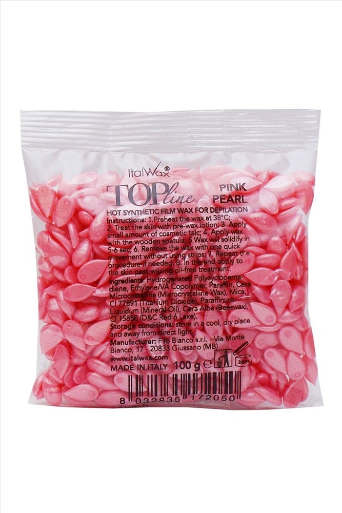 Ital Wax Top Line Pink Pearl — перламутровый эластичный воск на синтетической основе мягко воздействует на кожу и отлично сцепляется с волосками. Благодаря тепловому воздействию кожа распаривается, волоски легко удаляются. Депиляция проходит без боли и неприятных ощущений. Не содержит натуральной сосновой смолы, вызывающей аллергию. Воски для депиляции на основе синтетических компонентов обладают особыми адгезивными свойствами: 100% сцепление с волосками, бережное отношение к коже. Особенности имеют низкую рабочую температуру +38°С; не оставляют покраснений на тонкой и светлой коже; не имеют аромата; обеспечивают комфортное удаление волос: без боли и неприятных ощущений; наносятся и снимаются в любом направлении, без учета направления роста волос; удаляют волоски от 1 мм. Способ применения: Разогрейте воск в электронагревателе до t + 38°С. Зону депиляции обработайте спиртосодержащим лосьоном. Нанесите небольшое количество талька. Нанесите шпателем тонкий слой воска независимо от направления роста волос, но по направлению к себе, оставляя небольшой «лепесток», за который потом можно будет ухватиться (подмышку стараемся депилировать одной аппликацией). ВНИМАНИЕ! Наносите не торопясь, тщательно нажимайте на шпатель, прикладывая необходимые усилия. Воск застынет через 5-6 секунд (готовый к удалению воск не должен липнуть к руке при касании). Предварительно натянув кожу в направлении, противоположном отрыву, резким движением удалите воск в направлении от себя параллельно коже. Повторите процедуру на следующем участке. После окончания депиляции обработайте кожу успокаивающим, охлаждающим, не содержащим масел, средством. Состав: Hydrogenated polycyclopentadiene, Ethylene/VA Copolymer, Paraffin, Cera Microcristallina (Microcrystallina Wax), Paraffinum Liquidum (Mineral Oil), Сera Alba (Beeswax), Ci 77891, CI 15850, CI 77019.