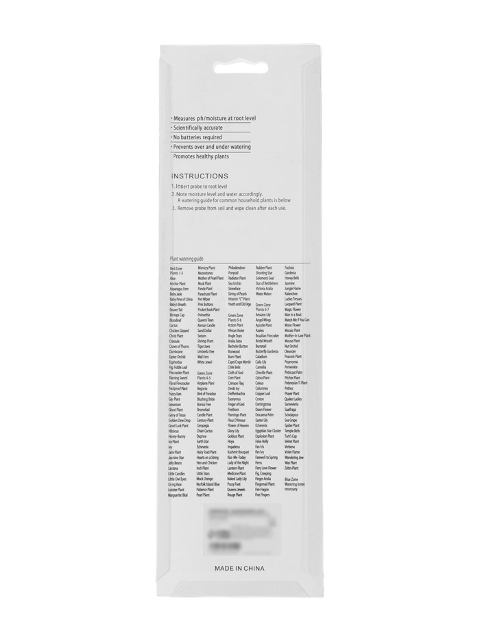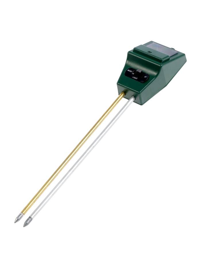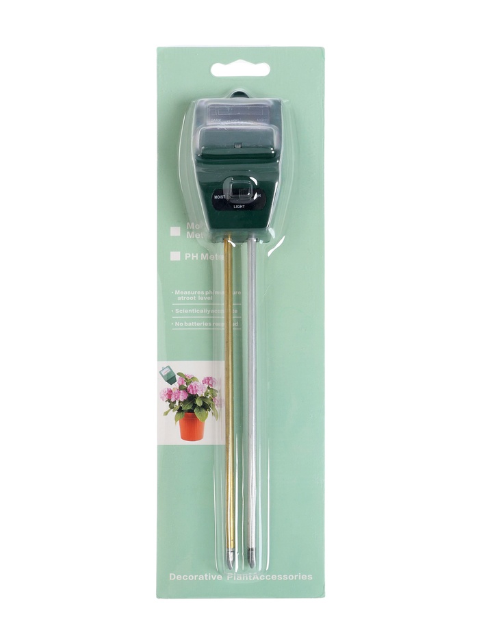 Страна: Китай В боксе: 100 шт Состав: Металл, пластик Материалы: металл, пластик Фасовка: по 1 шт Индивидуальная упаковка: Блистер Габариты товара: 29 см × 5 см × 3,5 см Сертификат: Не подлежит сертификации Тип питания: От солнечной батареи Цвет: Зелёный Гарантийный срок, мес.: 6 Материал корпуса: Пластик Диапазон измерений, pH: 3.5 - 8 Измеритель параметров почвы 3 в 1 позволяет определить влажность, уровень pH (кислотность) и освещённость почвы. Подходит для комнатных растений, рассады, теплиц и открытого грунта. Помогает контролировать условия выращивания без использования батареек. ПрименениеПростой в использовании прибор помогает своевременно корректировать полив и уровень кислотности почвы, обеспечивая здоровый рост растений. Компактный размер и лёгкий вес делают его удобным для регулярного контроля состояния грунта. КомплектацияДополнительноКомментарии к товару