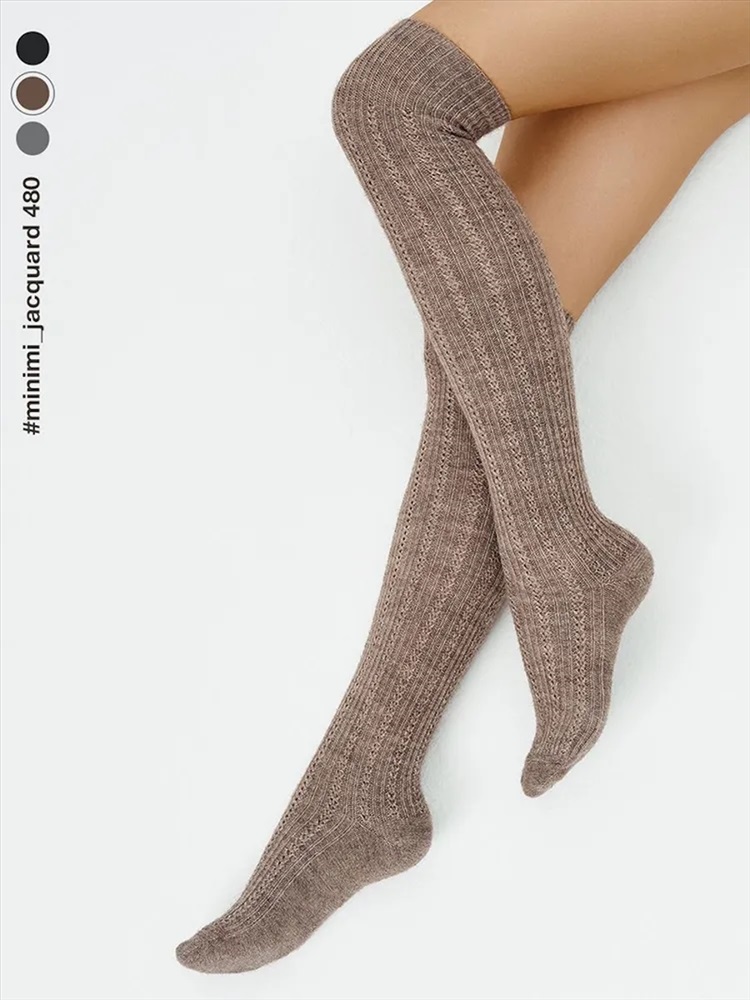 Теплые ботфорты из шерсти и акрила, с усиленным мыском и широкой резинкой. По всей длине модели размещен рельефный рисунок "цепочки".
