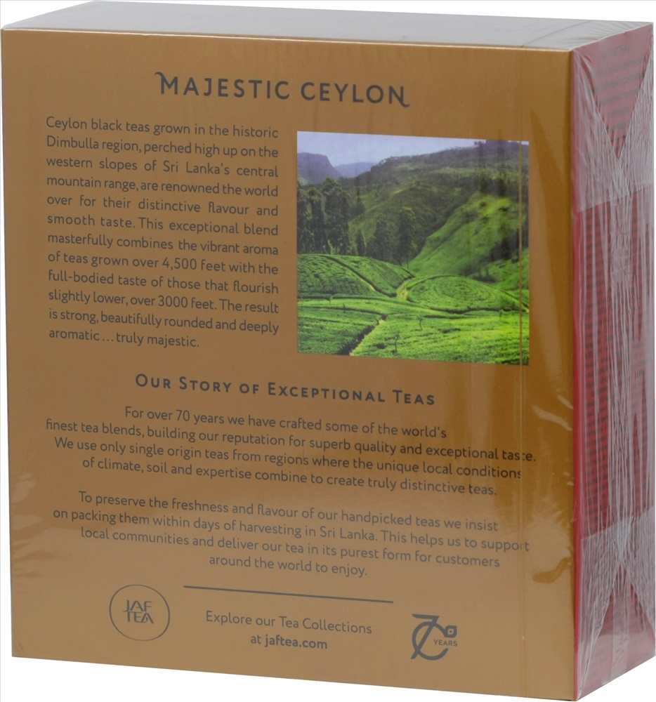Чай черный цейлонский пакетированный.Majestic — это высококачественный купаж чая, собранного с лучших плантаций о. Цейлон. Настою яркого янтарного цвета присущ изысканный глубокий, крепкий вкус и сложный многогранный аромат с ярко выраженными солодовыми и терпкими нотами.
