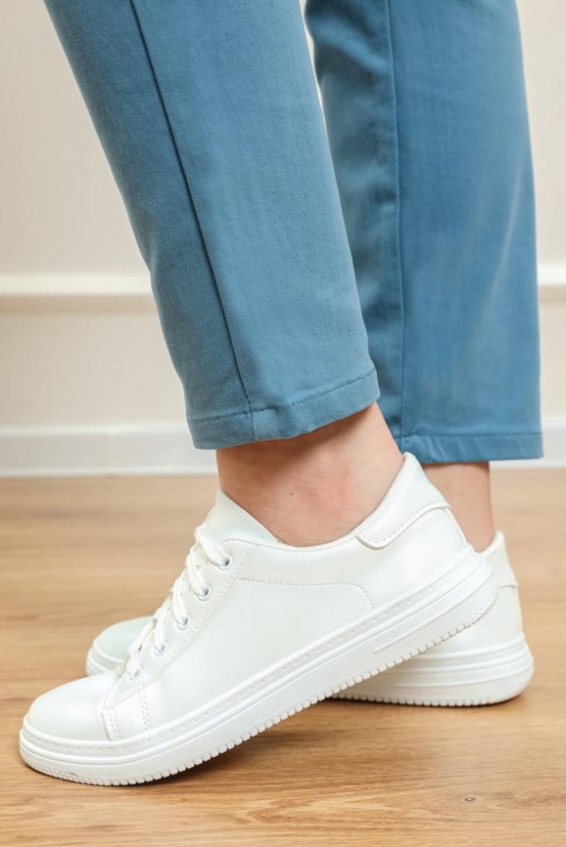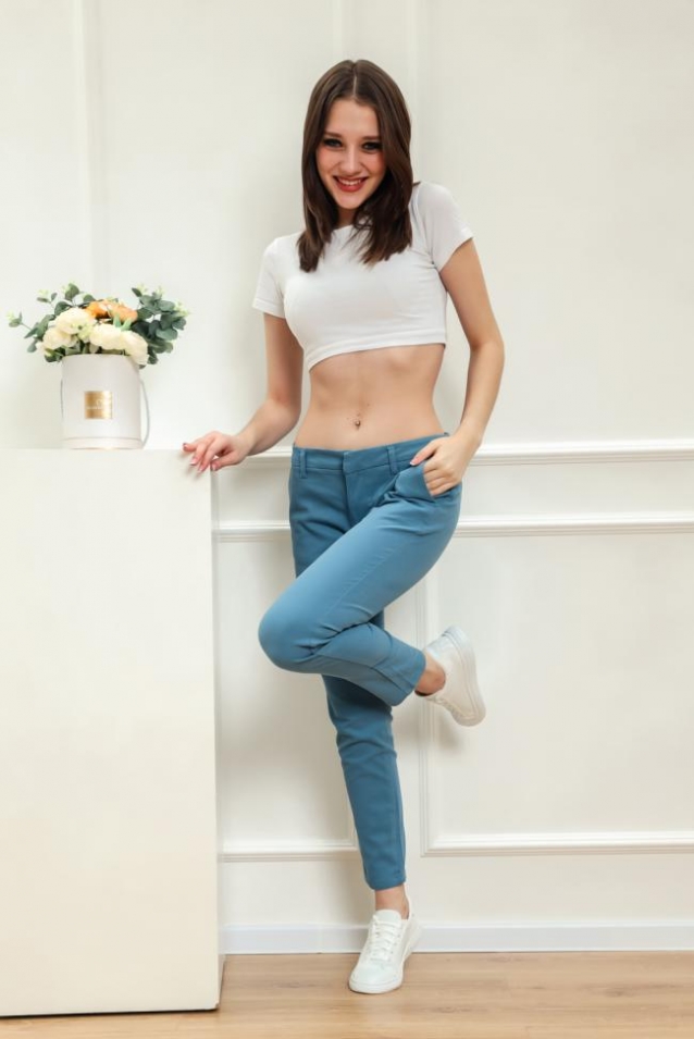 Женские брюки выполнены из плотной хлопковой ткани с добавлением полиэстера для прочности и долговечности.