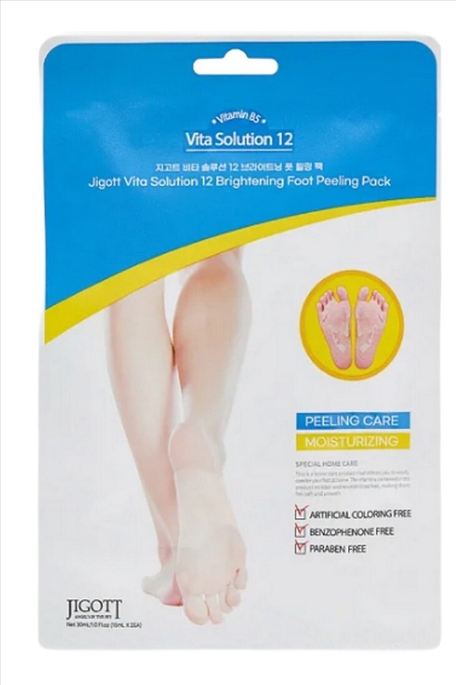 Маска-носки JIGOTT с эффектом пилинга содержит витамины и натуральные экстракты. Дарит интенсивный уход для кожи ног в домашних условиях. Продукт с удобным форматом фиксируемых носочков увлажняет и питает уставшую кожу ступней, делая её мягкой, сияющей и гладкой. Средство отшелушивает грубую и сухую кожу, удаляя омертвевшие клетки, и стимулирует обновление кожи ног. Увлажнение и гладкость появляются сразу после применения маски, а еще через 4-6 дней омертвевшая кожа начинает отслаиваться естественным образом. Результат – чистая, мягкая и ухоженная кожа стоп. Способ применения: Наносите на чистые и сухие ноги. Откройте упаковку, достаньте маску и наденьте на каждую ногу, зафиксировав носочки. Оставьте на 30 минут, периодически массируя ступни в носочках для более интенсивного действия маски, затем снимите её. Тщательно помойте ноги для удаления остатков продукта. Через 4-6 дней омертвевшая кожа начнет отслаиваться естественным образом. Не используйте для ее удаления абразивные вещества и другие средства механического воздействия. Состав: Alcohol Denat., Water, Lactic Acid, Glycolic Acid, Pгopylene Glycol, Sodium Citrate, Hydroxyethylcellulose, Phenoxyethanol, PEG-60 Hydrogenated Castor Oil, Fragrance, Citric Acid, Salicylic Acid, Panthenol, Hippophae Rhamnoides Extract, Chamomilla Recutita (Matricaria) Flower Extract, Broussonetia Kazinoki Root Extract, Nelumbium Speciosum Flower Extract, Morus Alba Bark Exlract, Malus Domestica Fruit Extract, Camellia Japonica Leaf Extract, Camellia Sinensis Leaf Extract, Centella Asiatica Extract, Vaccinium Vitis-ldaea Leaf Extract, Tricholoma Matsutake Extract.