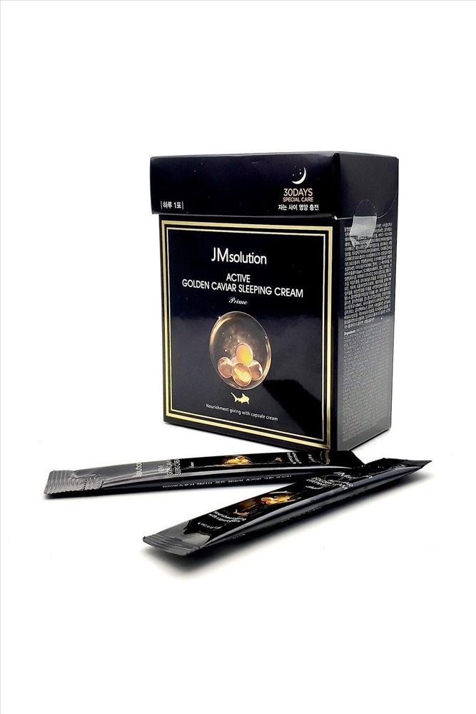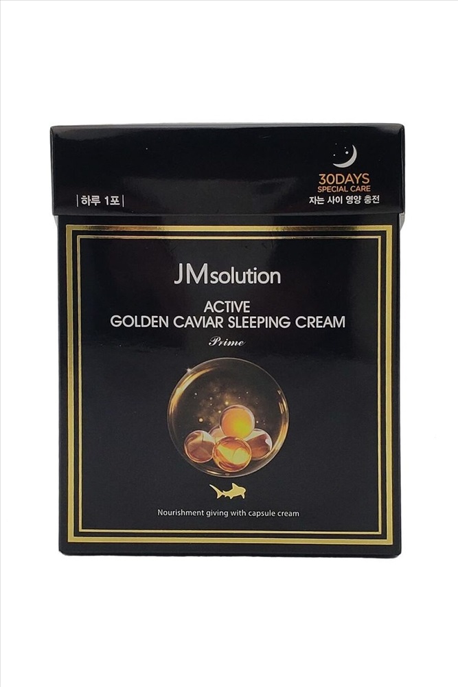 Ночная маска с золотом и икрой JMsolution Active Golden Caviar Sleeping Cream Prime активно питает кожу, устраняет сухость, шелушения и замедляет процессы старения. Маска эффективно повышает упругость и эластичность кожи, укрепляет тургор и помогает в борьбе со старением кожи. Интенсивно питает, в кратчайшие сроки избавляя от сухости и чувства стянутости. Восстанавливает защитные функции кожи и укрепляет липидный барьер эпидермиса, нейтрализуя агрессивное воздействие внешних факторов. Улучшает цвет лица и возвращает коже здоровое сияние. Основные действующие компоненты: Экстракт икры активизирует выработку коллагена, количество которого с возрастом уменьшается, возвращая коже эластичность и упругость. Обеспечивает активное питание и омоложение кожи, разглаживает мимические и возрастные морщины и кожные заломы, подтягивает овал лица. Золото 24К повышает тургор, обладает фотопротекторными свойствами, защищая кожу от ультрафиолета, осветляет пигментацию, усиливает степень проникновения активных компонентов в глубокие слои. 3 вида гиалуроновой кислоты активно увлажняют, проводя влагу глубоко в клетки эпидермиса, создают на поверхность кожи барьер, предупреждающий испарение влаги и поддерживающий оптимальный уровень увлажнения, устраняют сухость и шелушения. Экстракт листьев полыни оказывает бактерицидное, антисептическое, противовоспалительное действие. Нормализует гидро-липидный баланс кожи. Экстракт календулы лекарственной оказывает антибактериальное и противовирусное воздействие на кожу, регенерирует покровы, снимает покраснения, зуд, раздражение, используется при куперозе, нормализует гидролипидный баланс, убирает жирный блеск. Рекомендуется для сухой и зрелой кожи. Способ применения: Нанесите необходимое количество маски завершающим этапом вечернего ухода.