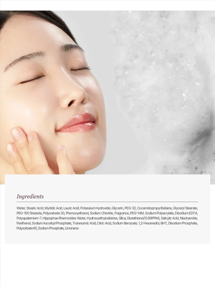 Water, Stearic Acid, Myristic Acid, Lauric Acid, Potassium Hydroxide, Glycerin, PEG-32, Cocamidopropyl Betaine, Glyceryl Stearate, PEG-100 Stearate, Polysorbate 20, Phenoxyethanol, Sodium Chloride, Fragrance, PEG-14M, Sodium Polyacrylate, Disodium EDTA, Polyquatemium-7, Hippophae Rhamnoides Water, Hydroxyethylcellulose, Silica, Glutathione(10.89PPM), Salicylic Acid, Niacinamide, Panthenol, Sodium Ascorbyl Phosphate, Tranexamic Acid, Citric Acid, Sodium Benzoate, 1,2-Hexanediol, BHT, Disodium Phosphate, Polysorbate 60, Sodium Phosphate, Limonene.
