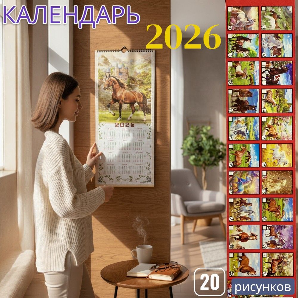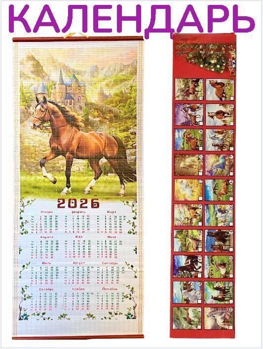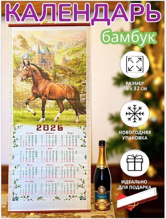Вес уп.(гр) ~: 96 Календари Символ года, 2026. бамбук 76х32см В ассортименте 20 картинок, в коробке 600шт