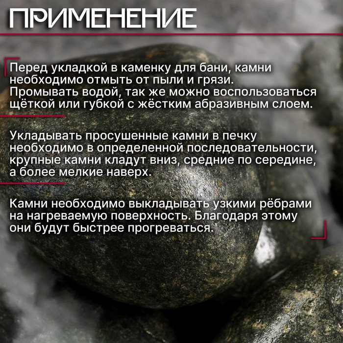 Выбирайте для бани и сауны только специальные камни, которые не трескаются от перепадов температуры и не выделяют вредных веществ. Одной из таких пород является оливин. Этот уникальный экологически чистый камень не выделяет при нагреве вредных и токсичных веществ и традиционно применяется в дровяных печах для парилок. Плотность оливина позволяет камню выдерживать многократные циклы нагрева-охлаждения. Камень обладает высокой теплоёмкостью и термостойкостью. Считается, что оливин нормализует давление, благотворно влияет на работу сердечно-сосудистой системы, помогает справиться с простудными заболеваниями. В процессе обваловки выбраковываются камни с внутренними трещинами, поэтому в комплект попадают только качественные камни. Как укладывать камни для бани Перед началом работы тщательно промойте их. Внизу выложите крупные камни, а мелкие разместите сверху. Для хорошей теплоотдачи и свободного выхода пара не укладывайте их слишком плотно. Чтобы было больше пара и камни не повреждались, обливайте их только горячей водой. Периодически осматривайте кладку и заменяйте треснувшие элементы на новые. Камни различных пород можно сочетать друг с другом. Срок службы оливина составляет до 2 лет. ПрименениеОливин обладает широким спектром целебных свойств — от благотворного влияния на зрительные органы до нормализации работы нервной системы. Внешне он напоминает плоды оливкового дерева, что доставляет эстетическое удовольствие при парении. Комментарии к товару