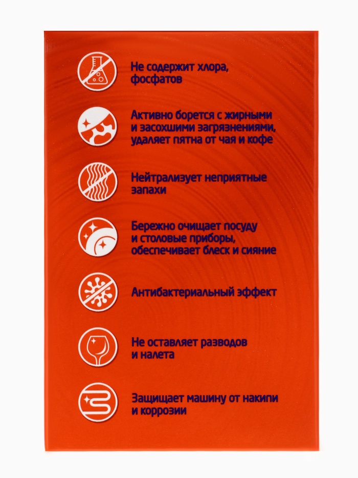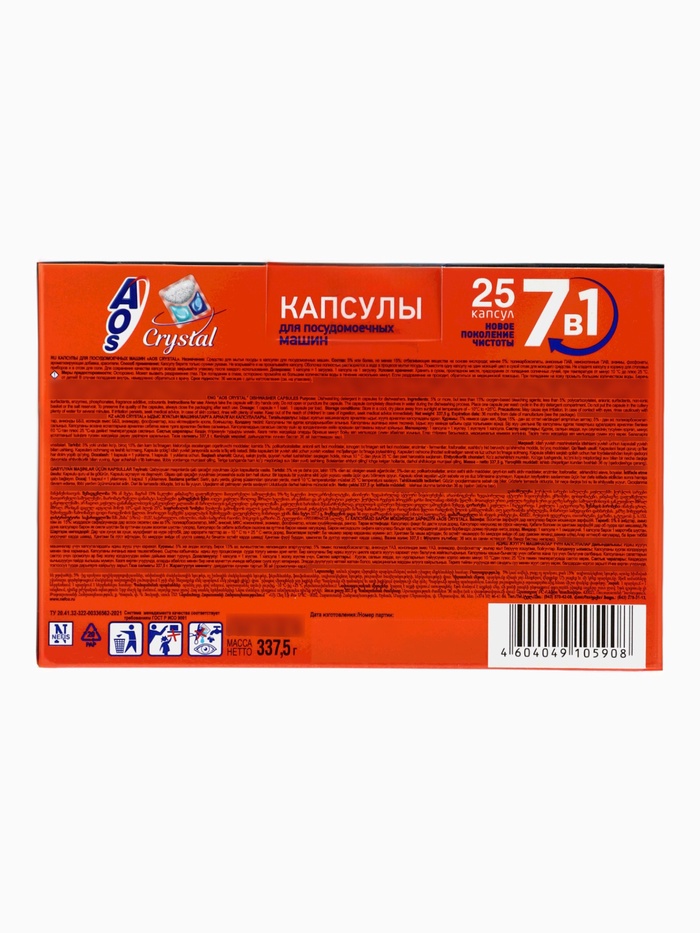 Габариты: 18 x 8 x 12 Страна: Россия В боксе: 4 шт Состав: См. на упаковке Материалы: см. на упаковке Фасовка: по 1 шт Индивидуальная упаковка: Без упаковки Сертификат: Не подлежит сертификации В упаковке, шт.: 25 Фиксированная цена: Да Экологичные таблетки для посудомоечной машины. Предназначены для мытья посуды и столовых приборов в посудомоечных машинах любого типа. Активно борется с жирными и засохшими загрязнениями, удаляют пятна от чая и кофе. Нейтрализует неприятные запахи. Бережно очищает посуду и столовые приборы, обеспечивает блеск и сияние. Обладает антибактериальным эффектом. Не оставляет разводов и налета. Защищает машину от коррозии. Способ применения: поместить таблетку в отсек для моющего средства посудомоечной машины. Таблетку используют, не снимая защитную пленку. Включить посудомоечную машину и запрограммировать ее, как описано в инструкции по ее эксплуатации. Меры предосторожности: хранить в закрытом виде, в сухом месте при температуре от -5 до +35С, относительной влажности воздуха не более 75%. Хранить отдельно от пищевых продуктов, в недоступном для детей местах. Избегать попадания в глаза, рот и на поврежденные участки кожи. В случае попадании обильно промыть водой. Не употреблять внутрь. Срок годности 4 года с даты изготовления. Состав: 30% цитрат натрия, 15% карбонат натрия, 15% отбеливающие вещества на основе кислорода, 5% силикат натрия, поликарбоксилаты, неионогенные пав, энзимы, красители. Ароматизированные: Нет. Таблетки для посудомоечных машин Aos Crystal 25 штук, 1 штука. Комментарии к товару