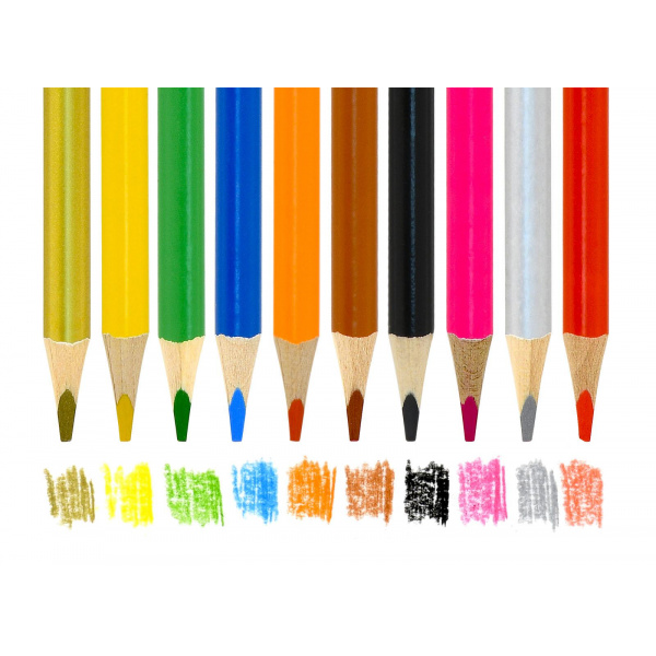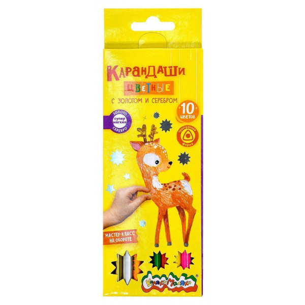 Набор с золотом и серебром подарит сказку маленькому художнику. Яркие, мягкие карандаши легко затачиваются. Ими приятно рисовать, развивать мелкую моторику и цветовосприятие. Трехгранный корпус приучает маленького художника правильно держать ручку, а золото и серебро добавят волшебства в произведения юного творца..