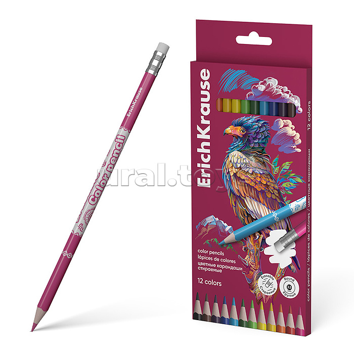 • Количество цветов: 12. • Круглый корпус. • Диаметр грифеля: 3,3 мм. • Стираемые с ластиком. • Материал корпуса: дерево. • Соответствует требованиям безопасности продукции. • Для детей от 3-х лет.