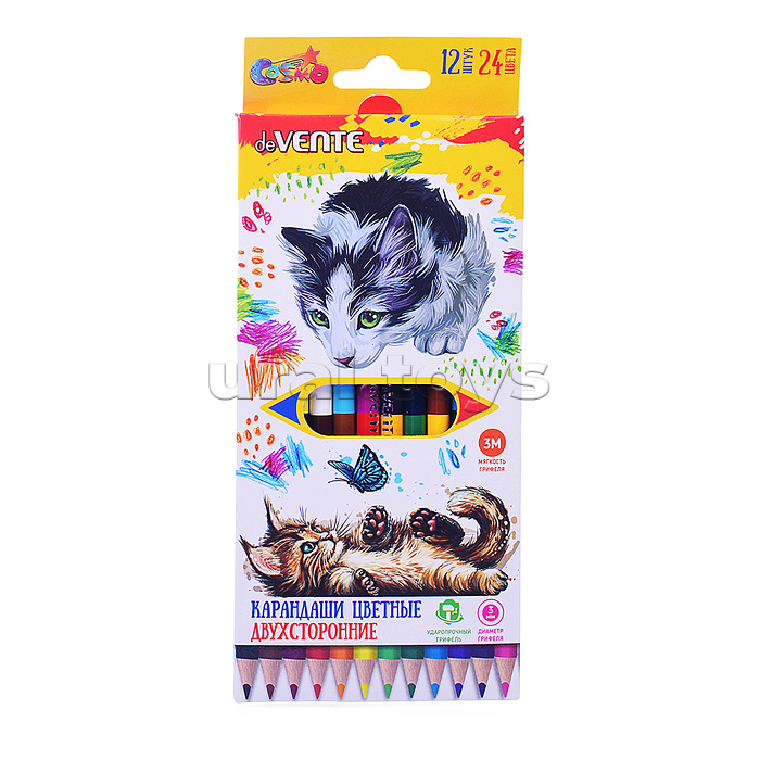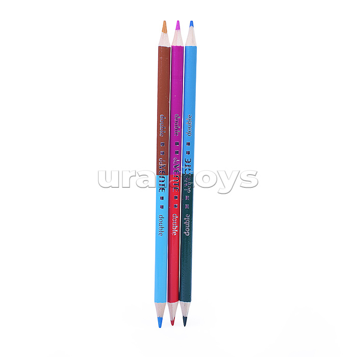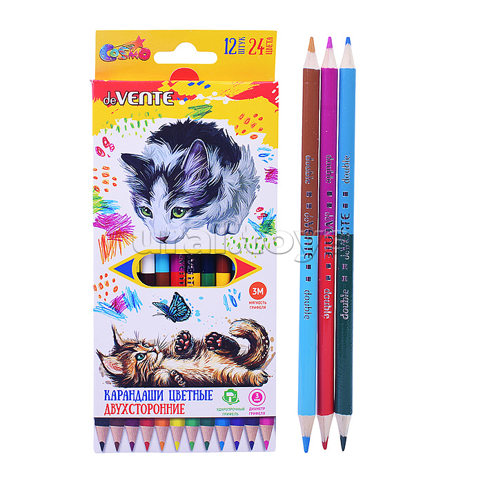В наборе 12 двухсторонних карандашей - 24 цвета - насыщенные цвета - ударопрочный грифель - круглый корпус из натурального дерева - легко затачиваются - мягкость грифеля 3м - диаметр грифеля 3мм