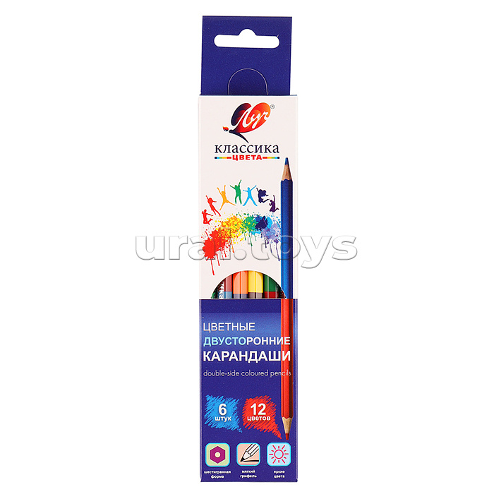 Код: 458048 Страна производитель: Россия Размеры упаковки: 21 x 5 x 1 см Количество в коробке: 24 В наборе 6 двухсторонних карандашей - 12 цветов. Профиль карандаша - шестигранный. Имеют идеально отцентрованный мягкий прочный грифель. Яркие насыщенные цвета. Соответствует требованиям безопасности продукции. Комментарии к товару