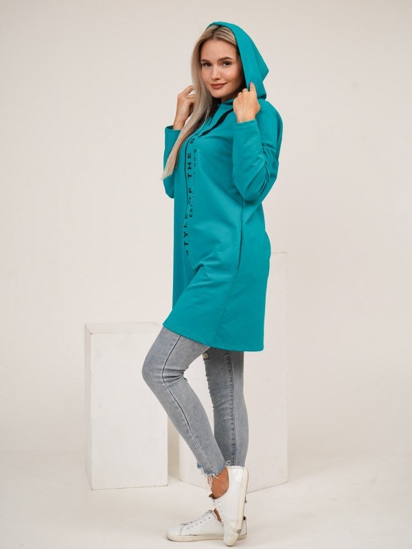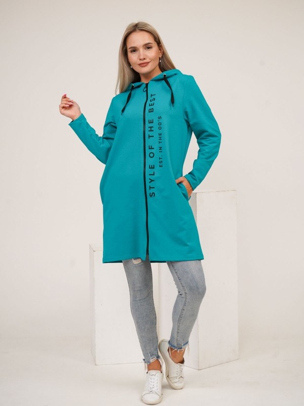 Кардиган женский свободного силуэта длинной выше уровня колена. На полочках присутствуют карманы в боковых швах. Кардиган с двойным капюшоном и шнурком.