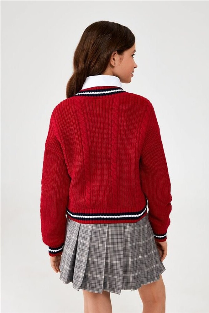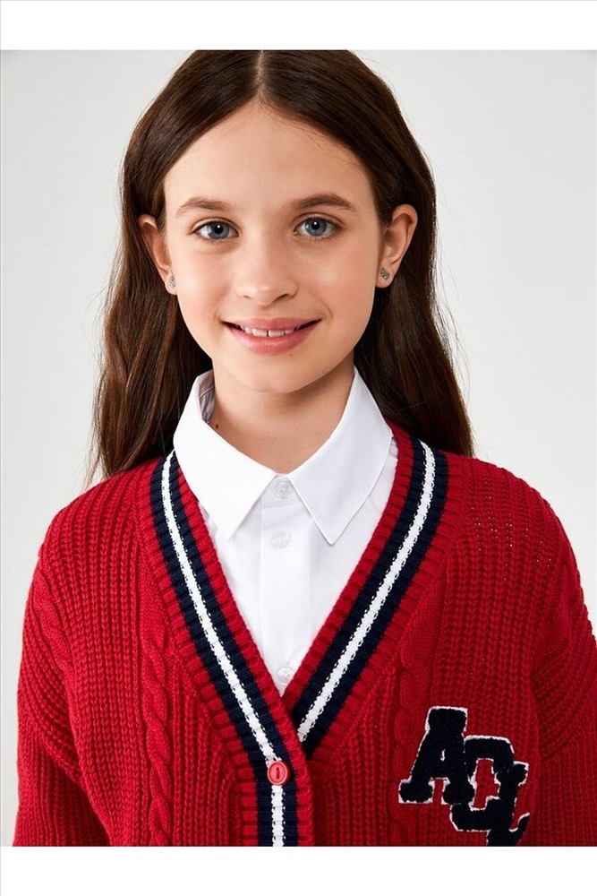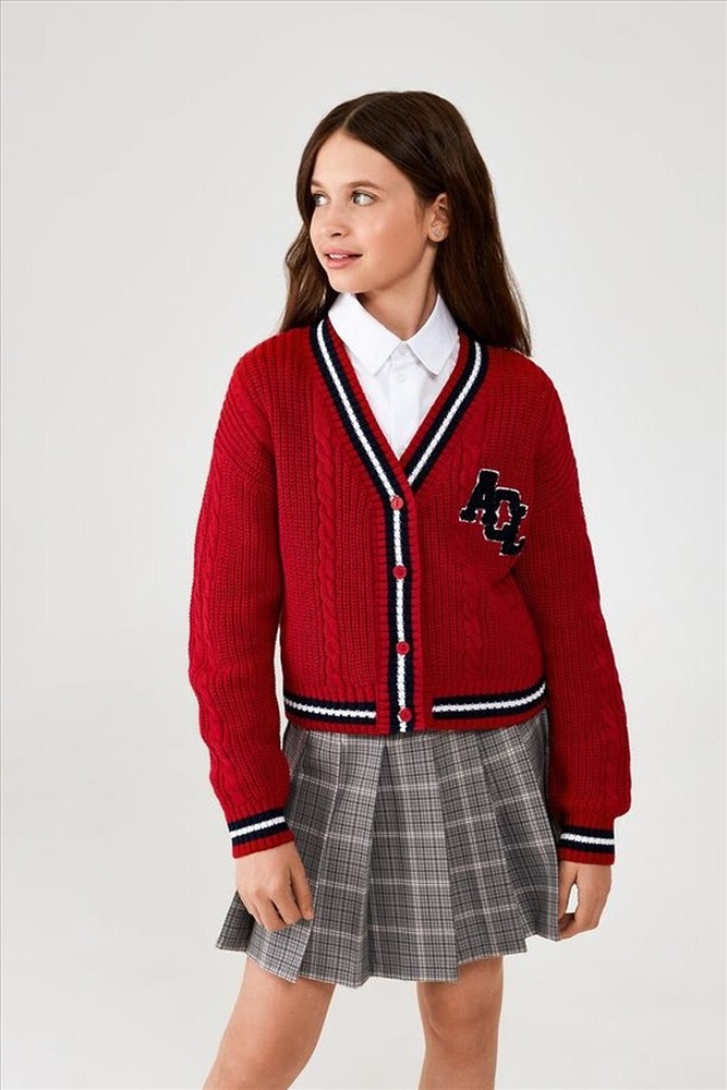 Детский вязаный кардиган для девочки из школьной коллекции выполнен с изящной вязкой "косы", что придаёт изделию особую текстуру и стильный внешний вид. V-образный вырез горловины добавляет элегантности, а длинные рукава обеспечивают тепло в прохладные дни. Застёжка на пуговицы делает кардиган практичным и удобным в носке. Манжеты, горловина и низ изделия обработаны рибаной с контрастными полосками, что не только улучшает прилегание к телу, но и помогает сохранить тепло. Спереди модель украшена вышивкой "ACL", которая добавляет оригинальности и индивидуальности. Стилизуйте кардиган из casual коллекции с рубашкой и юбкой для создания комфортного образа на каждый учебный день или внешкольные занятия. Рост модели на фото 146 см. Размер модели на фото 140.