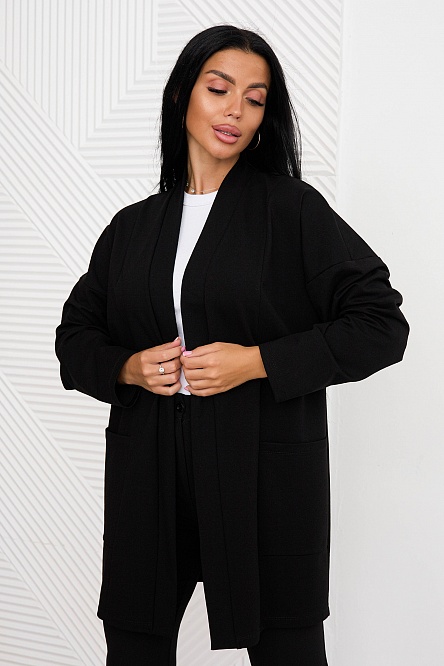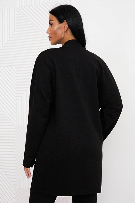 72% Хлопок, 20% П/Э, 8% Лайкра Тип ткани: футер Женственный кардиган в классическом черном цвете из футера. Модель свободного силуэта, удлиненная спинка, спущенный рукав свободной формы. Кардиган отлично подойдет как для прогулок, так и для повседневного применения в прохладное время года.