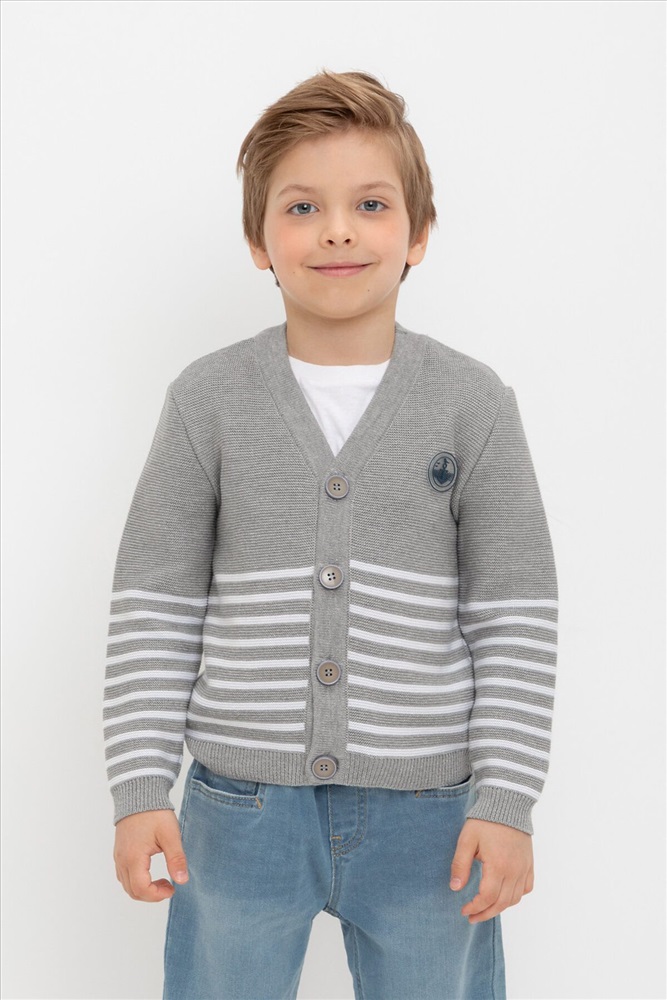 ID товара: 1022480 Акции: -3%, до 23.11.2025 Состав: Хлопок 50%, Акрил 50% Сезон: Весна/Лето Длина: Средняя Фасон: Прямой Рукав: Длинный Вид застежки: Пуговицы Вырез горловины: V-образный Рисунок: Полоска Основная ткань: Хлопок Стиль: Повседневный Страна бренда: Россия Страна производства: Россия Вязаный кардиган в полоску для мальчика с втачными рукавами. Связан из хлопковой пряжи. На рукавах эластичные манжеты. Внизу мягкий пояс. Застёгивается на пуговицы. Комментарии к товару