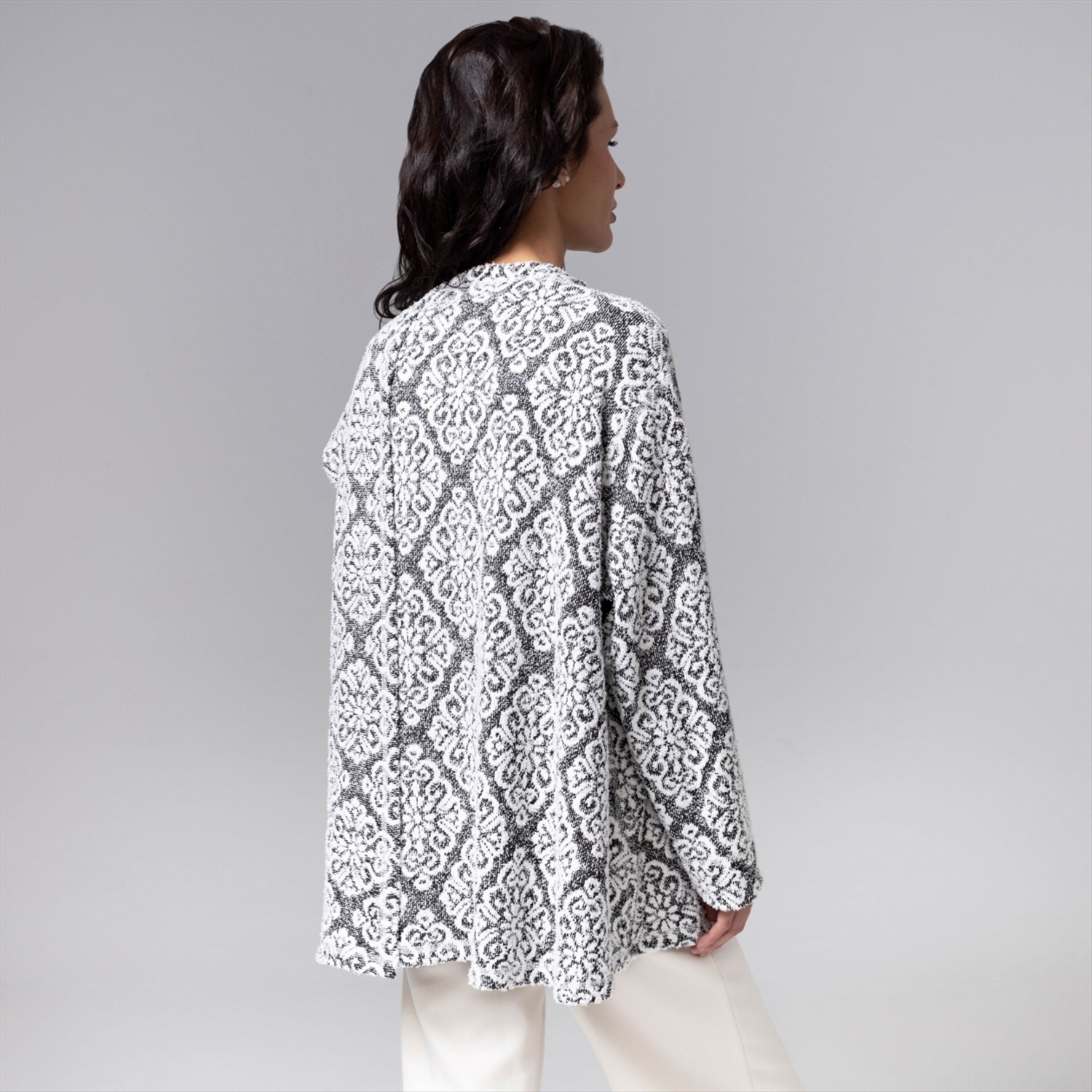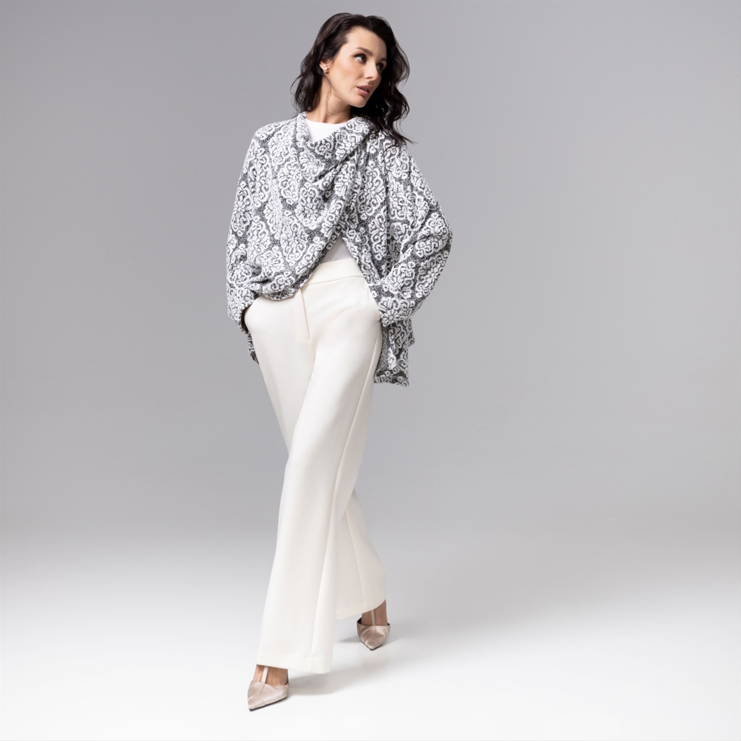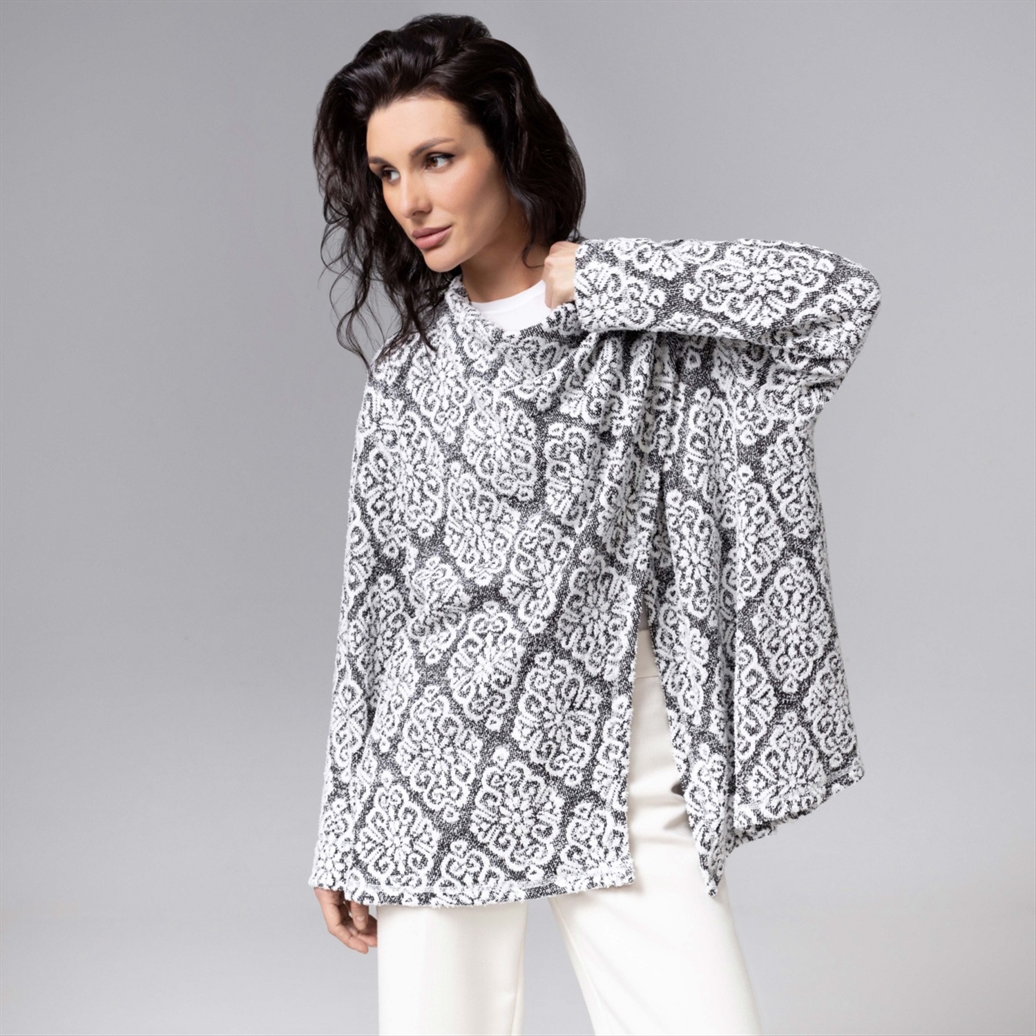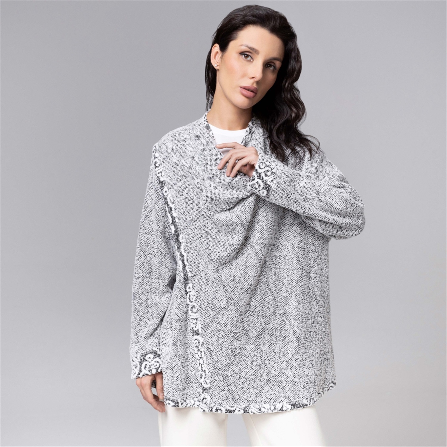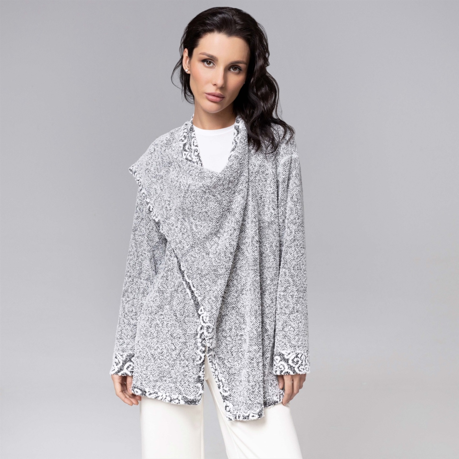 Этот кардиган – как два персонажа в одном: снаружи – деловая серьёзность, внутри – уютный плед для душевных разговоров. Меняйте сторону, как настроение. Вот он – настоящий «Секрет уверенности». Кардиган двустороний. Сложный конструктивный замысел позволяет создавть вариации образов. Многослойная фактура ткани, сочетает мягкость и эластичность высококачественного трикотажа, а крой позаботился о безупречной посадке. Идеально подойдет на любой тип фигуры.Кардиган one size. До 52 размера.