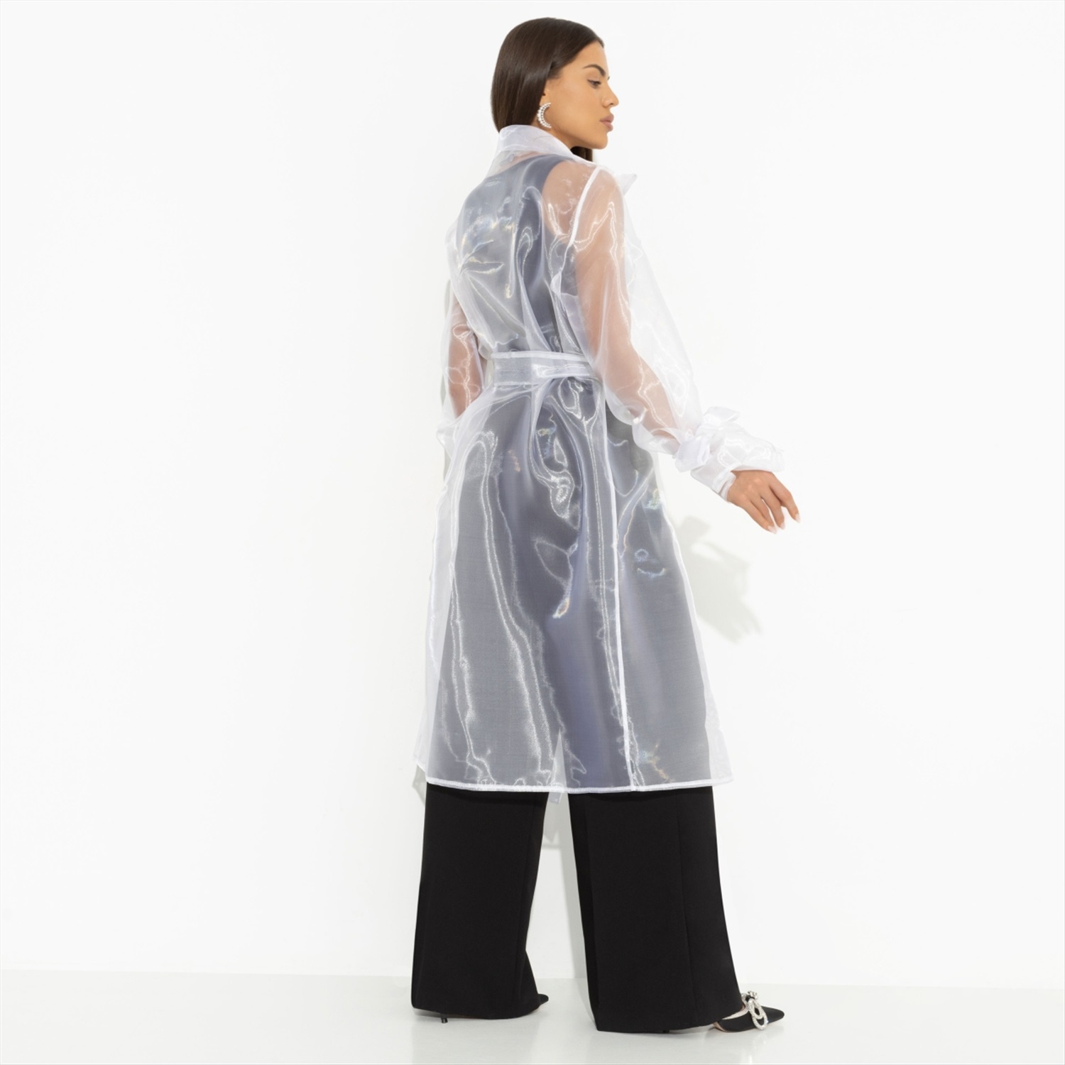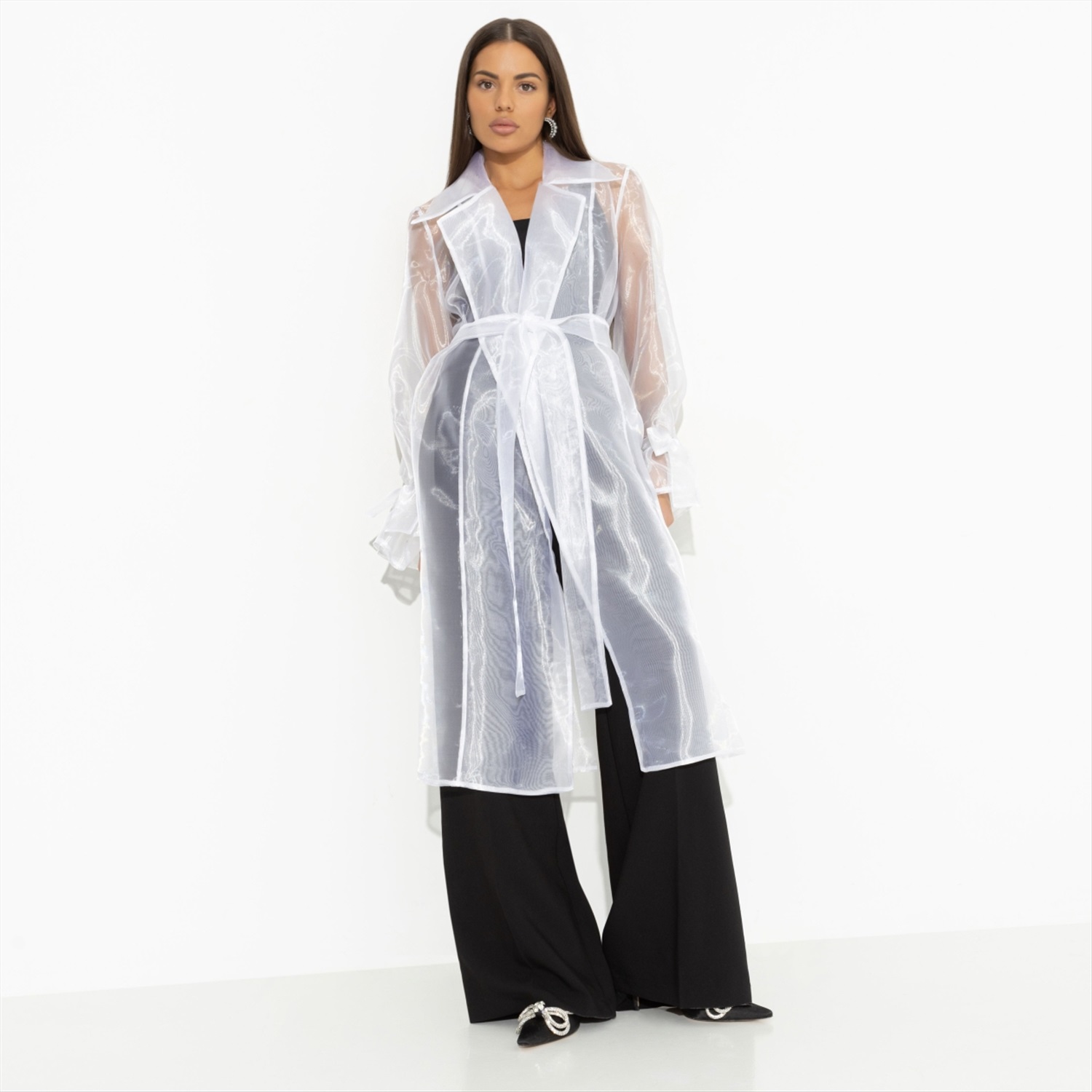 Ты хотела удивить его, а удивила сама себя. Кардиган CHARUTTI в прозрачном белом цвете пришел в твою жизнь, словно праздник. И теперь поход на почту, в кафе с подругами, на свидание и в музей выглядят совсем иначе. Кардиган в стиле тренча. Изделие с лацканами. Пояс в тон изделия в комплекте. Рукава оформлены завязками. Кардиган без застежек. Изделие полностью прозрачное. Походит в качестве второго слоя.