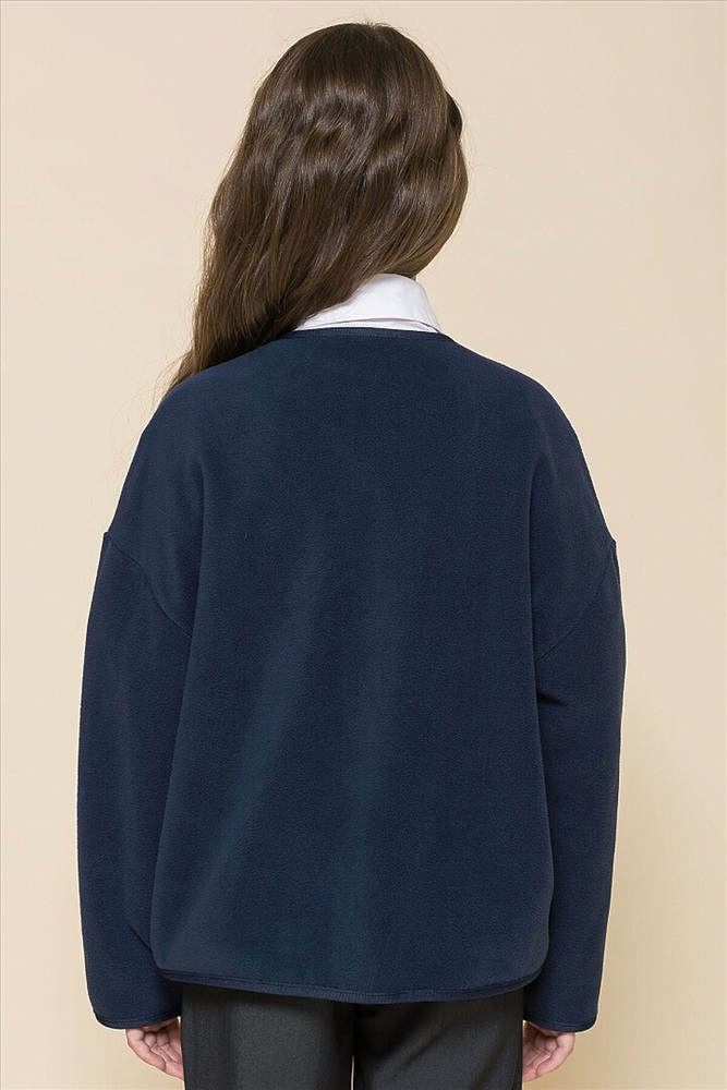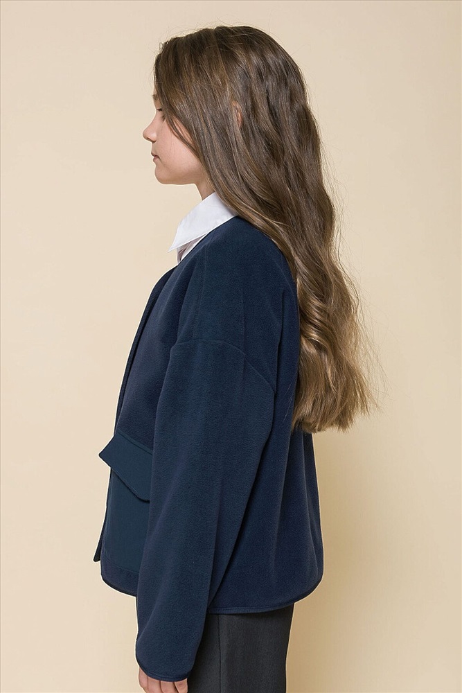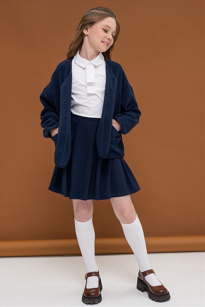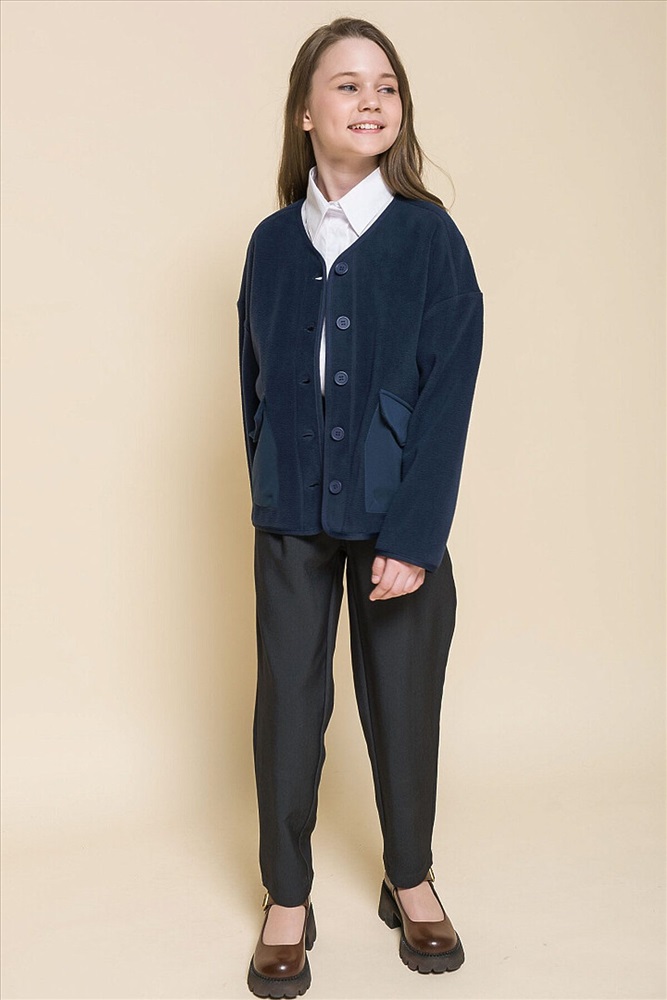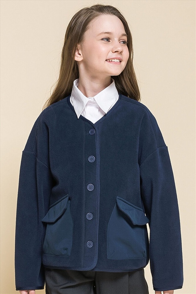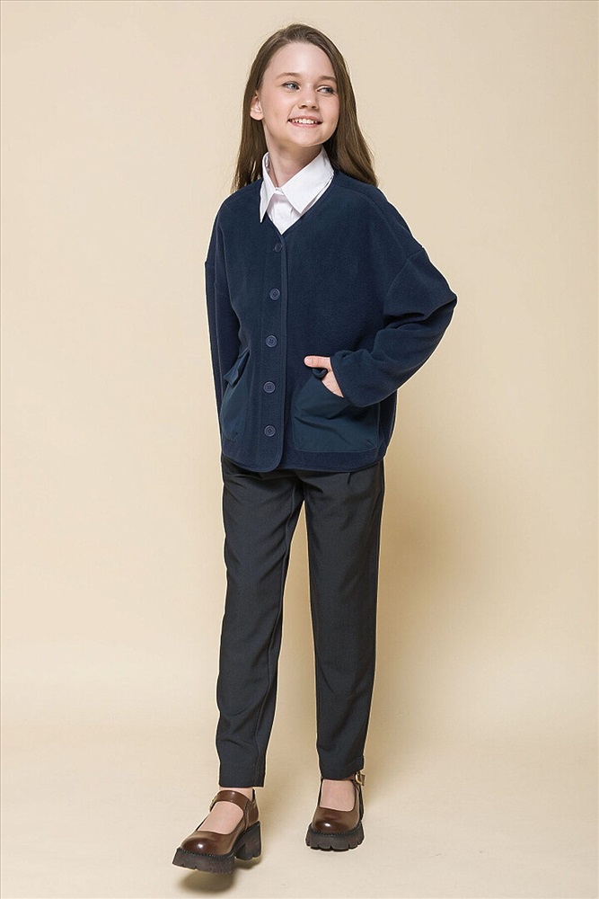 " Описание: Кардиган свободного силуэта для девочки. Модель выполнена из флиса — материал лёгкий, тёплый и неприхотлив в уходе. Объемный крой, спущенное плечо – настоящий трендовый оверсайз. Пуговицы тон в тон с матовым покрытием софт-тач — приятны на ощупь и добавляют кардигану изысканности. Два объёмных накладных кармана с клапанами выполнены из матовой курточной ткани — оригинально и стильно. Окантовка декоративной трикотажной тесьмой — актуальный модный тренд. Кардиган можно брать на вырост — благодаря свободному силуэту он долго не станет малым. Девочкам с любым типом фигуры в нем будет комфортно в течение всего дня. Стильный и практичный вариант как для Школы, так и за ее пределами. Состав: 100% полиэстер"
