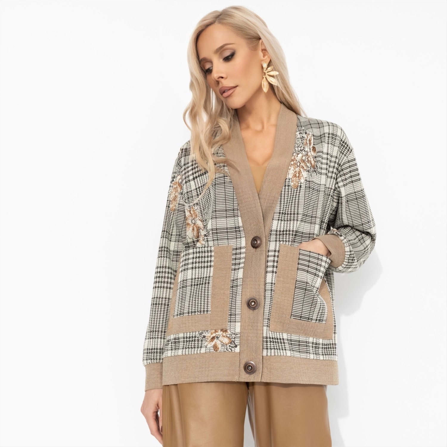 Когда девушка взрослеет, её стиль обретает ту самую утончённую элегантность. Мерой этой внутренней трансформации стал кардиган ЧАРУТТИ – его классическая клетка словно отсылает к вечным ценностям, обретая новый смысл. Безупречный крой говорит о глубоком понимании качества и гармонии. Надевая его, она ощущает не просто комфорт, а спокойную уверенность женщины, познавшей свою силу. Кардиган свободной посадки. Застегивается на пуговицы. Есть карманы по передней стороне изделия.