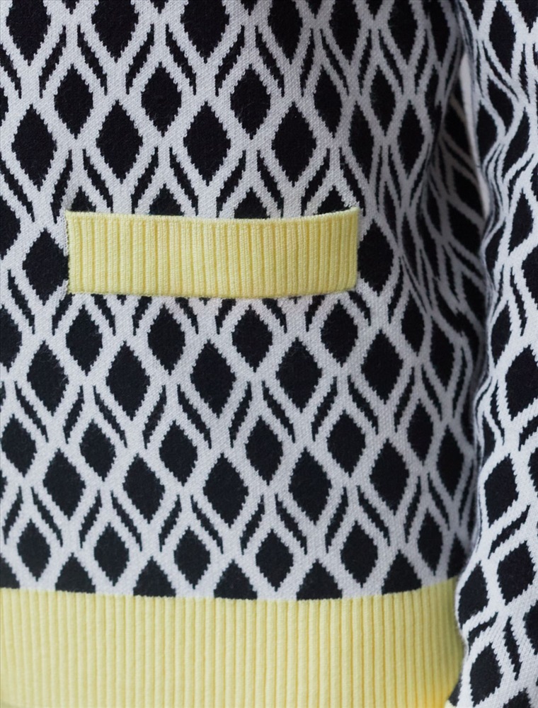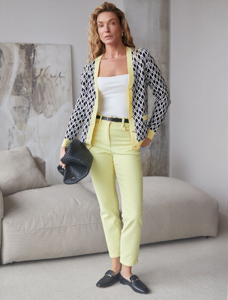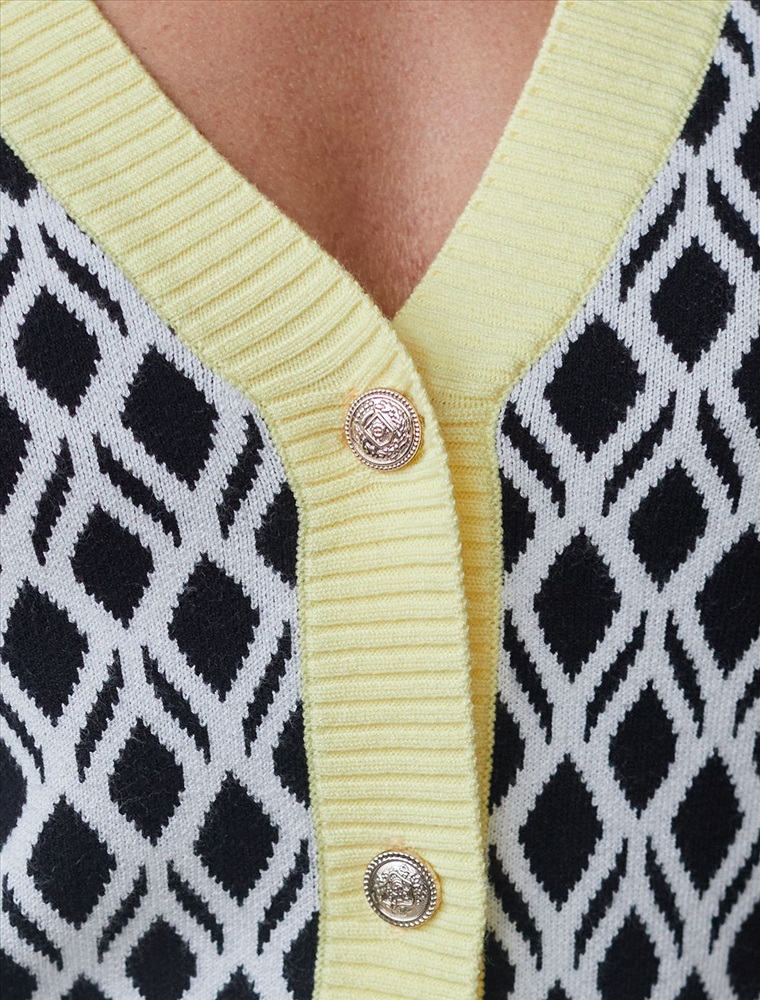 Кардиган с V-вырезом жаккардовой вязки — универсальная и женственная вещь для весны и лета. Бело-черный жакет выполнен из приятной к телу вискозы, отличается в меру свободным кроем, который подчеркивает силуэт. V-вырез подчеркивает зону декольте и визуально вытягивает шею, делая фигуру более изящной. Спущенная линия плеча создает расслабленный силуэт, добавляя комфорта и свободы движений, что отлично подойдет для девушек и женщин плюс сайз размеров. Модель на пуговицах обеспечивает удобство в носке и добавляет классическую нотку образу. Контрастная отделка гармонично сочетается с выразительным геометрическим рисунком, который придает образу индивидуальность и современность. Принт немного напоминает благородный орнамент аргайл, Карманы-обманки украшают, сохраняя лаконичность внешнего вида, Кардиган средней длины оптимален для создания разных комбинаций на каждый день. Такой жакет легко впишется в офисный или повседневный образ благодаря своей универсальности и современному стилю. Вискоза дарит ощущение комфорта даже в теплую погоду, а качественная жаккардовая вязка сохраняет форму после стирки.