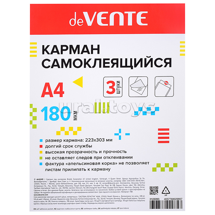 Формат: А4 ( 223*303 мм.) - 180 мкм. - высокая прочность и прозрачность. - не оставляет следов при отклеивании. - фактура "апельсиновая корка" не позволяет листам прилипать к карману. Материал: ПВХ.