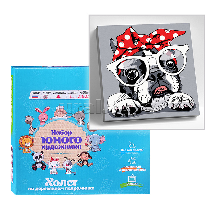 В наборе: - холст на деревянном подрамнике 20х20 см. - кисти 3 шт. - акриловые краски. - фурнитура для крепления. Соответствует требованиям безопасности продукции. Для детей от 14 лет.