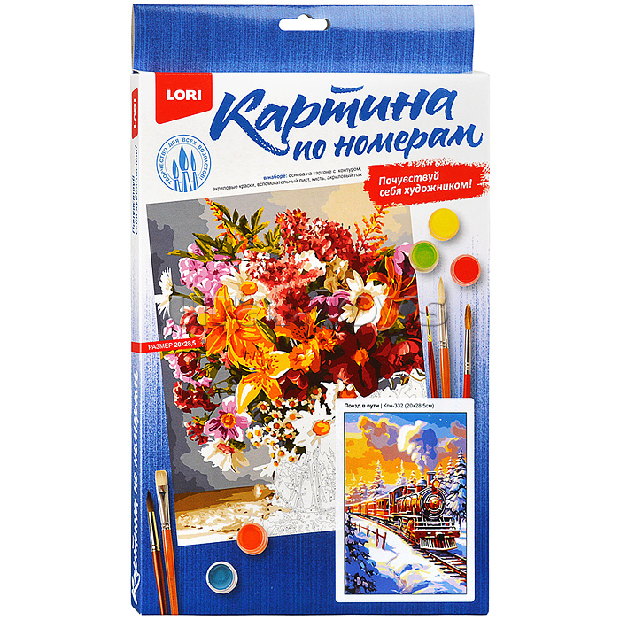 В наборе: - холст ( 20 х 28,5 см ). - акриловые краски. - акриловый лак. - вспомогательный лист. - кисть 1 шт. Соответствует требованиям безопасности продукции. Для детей от 6 лет.