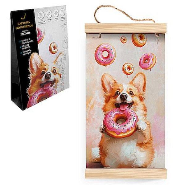 Набор для творчества Картина по номерам на свертке арт. 71269 / 50 КОРГИ С ПОНЧИКОМ, размер: 20х35 см, (10 цвета (-ов), холст с напечатанной схемой рисунка, краски акриловые на водной основе (упакованы в вакуумную упаковку), кисти художественные с ворсом из нейлона – 4 шт., деревянные держатели с подвесом, контрольный лист с нанесенной схемой в комплекте, картонная коробка)