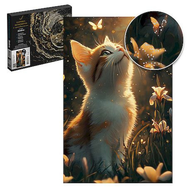 Набор для творчества Картина по номерам с кристаллами арт. 71289 / 24 КОТЕНОК И БАБОЧКИ, размер: 30х40 см, (20 цвета (-ов), холст на деревянном подрамнике с напечатанной схемой рисунка, краски акриловые на водной основе (упакованы в вакуумную упаковку), кристаллы, клей для кристаллов, кисти художественные с ворсом из нейлона – 4 шт., лак, пакет на zip-молнии, подвесы для подрамника, контрольный лист с нанесенной схемой в комплекте, картонная коробка с ручкой)