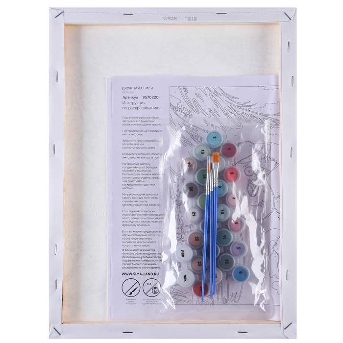 На холст нанесена схема, где пронумерован каждый сектор. Номер — цвет, написанный на баночке с краской. Нужно только раскрасить каждый сектор в соответствующий цвет. Картина может быть, как для личного пользования, так и в качестве подарка! Комментарии к товару